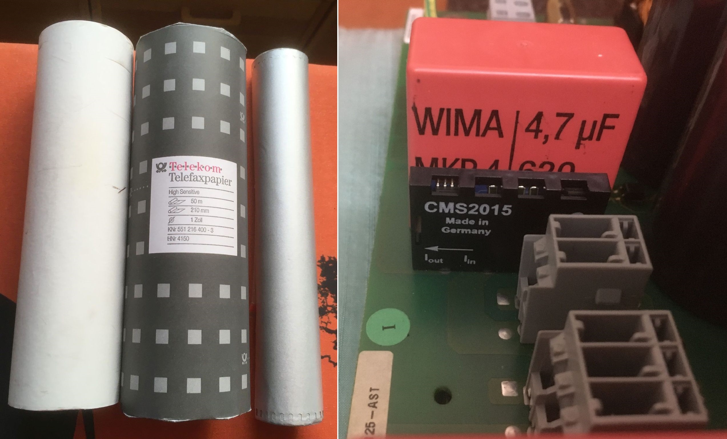 in der Umfrage waren Mehrfachnennungen nicht möglich. Ich war der Meinung, auch noch ein kleines Faxgerät zu besitzen und habe im Keller gesucht. Wahrscheinlich habe ich es bereits entsorgt und vergessen. Aber ich fand noch eine Rolle "hoheitliches" Telekom-Faxpapier (Thermo). Rechts daneben eine von Rohde & Schwarz, das mittels Funken beschrieben wird und metallisiert ist.