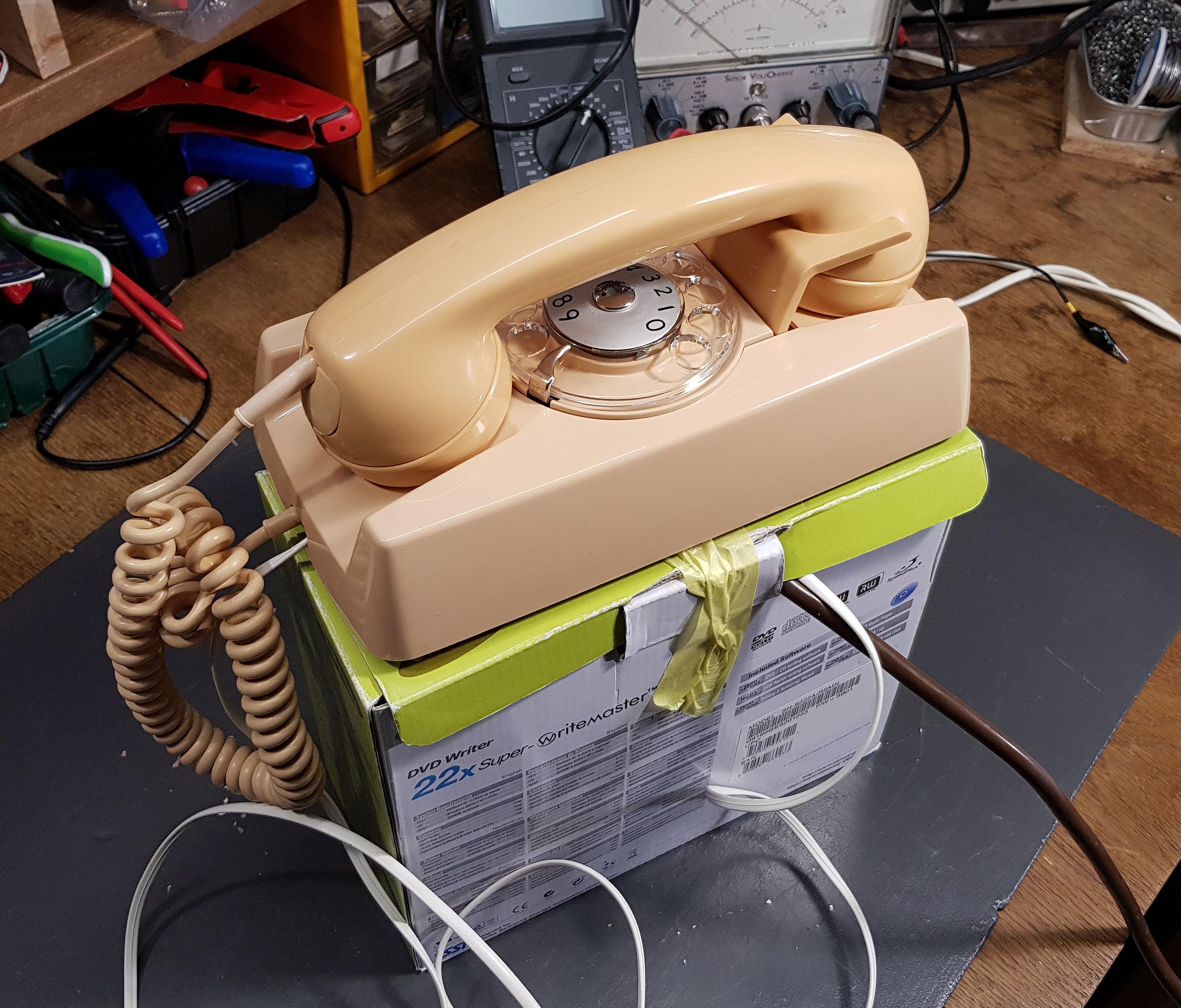 ist die genaue Anleitung. Ein Video ist auch dabei, dass den Verbindungsaufbau mit einem Wählscheibentelefon dokumentiert. Als ATA kommt eine Fritzbox 7113 zum Einsatz. Das Wählen mit dem Nummernschalter geht einwandfrei und der mechanische Wecker klingt schön laut. Jetzt muss ich noch eine 12-Volt-Bleigel-Batterie beschaffen und dann kommt alles in ein Gehäuse.