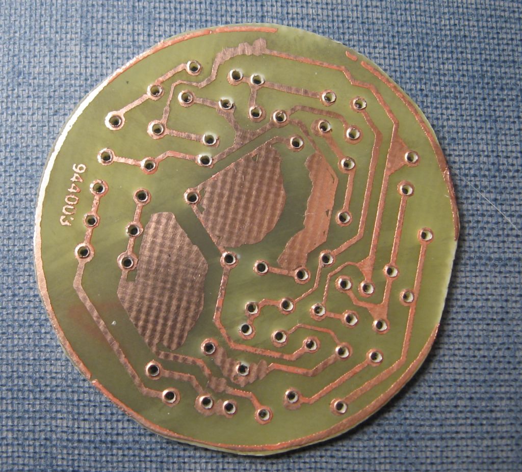die Platine hat einen Durchmesser von knapp 36 mm und wurde nach der Bügeleisenmethode hergestellt. An einigen Stellen musste mit einem Edding 3000 Stift ausgebessert werden. Als Papier kam dünnes Katalogpapier zum Einsatz. Geätzt mit einer 3 Jahren alten Eisen(III)chloridlösung, die ich in der Mikrowelle erwärmte. Die kreisrunde Form gelang mit einer Blechschere und einer Feile. Basismaterial ist Epoxid. Für die Bildbearbeitung kam IrfanView zum Einsatz, da der Screenshot aus der PDF gespiegelt werden muss und die Größe anzupassen ist.