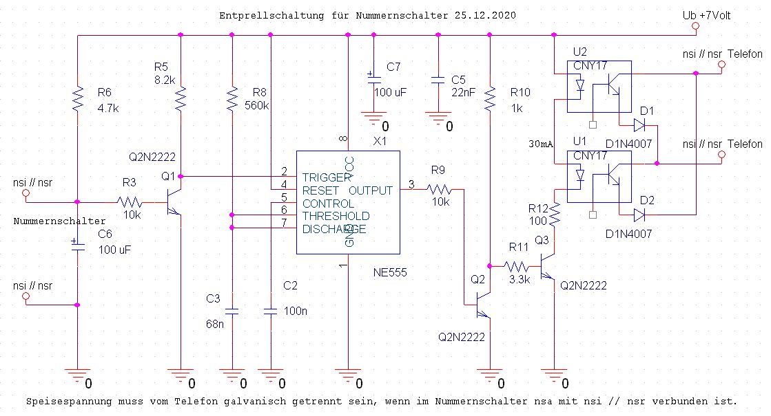 Ich habe deshalb deinen Vorschlag ausprobiert. Ich will ja keine Schaltungen veröffentlichen, die einen sinnlosen Aufwand betreiben. Der Nummernschalter verwählt sich ohne NE555 sofort, und es ist egal, ob der Elko 100 uF oder 10 uF besitzt.