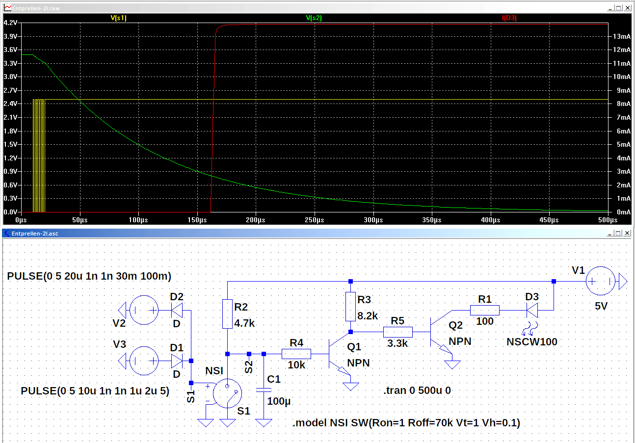 Wenn sich der nsi öffnet, dann lädt Kondensator C1 (blaue Linie). Sollte Prellen vorkommen, dauert das Laden länger, da jedes kurzzeitige Schließen den Kondensator recht schnell entlädt. Wenn das Prellen aufgehört hat, kann sich der Kondensator in Ruhe laden.