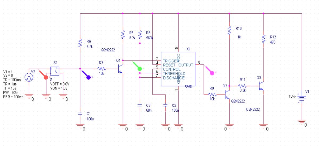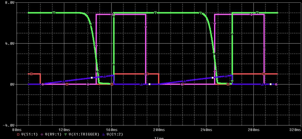 Das Ansteigen der Spannung an C1 sorgt dafür, dass am Kollektor von Q1 die Spannung fällt (grüne Kurve). Wenn die "grüne" Spannung auf 2 Volt gefallen ist, wird der Trigger des Monoflops ausgelöst und am Ausgang des Monoflops (violette Kurve) liegen etwa 7 Volt an, bis der Monoflop durch seine Zeitkonstante nach etwa 62ms wieder zurückfällt. Was in dieser Zeit am Trigger des Monoflops passiert, beeinflusst den Monoflop nicht. Wenn der nsi nach 62 ms wieder schließt, dann entlädt sich der Kondensator durch den Kurzschluss schlagartig (blaue Kurve), die Spannung am Kollektor des Q1 und damit am Trigger schießt nach oben (grüne Kurve). Das Monoflop fällt aber später ab (violette Linie), während der nsi noch geschlossen ist. Das Schließen des nsi passiert also dann, wenn das Monoflop noch läuft. Damit spielt es keine Rolle, wenn der nsi durch sein Schießen prellen sollte Und damit spielt das problematische Prellen des nsr auch keine Rolle, denn der nsr schließt auch, während das Monoflop noch läuft (violette Kurve).