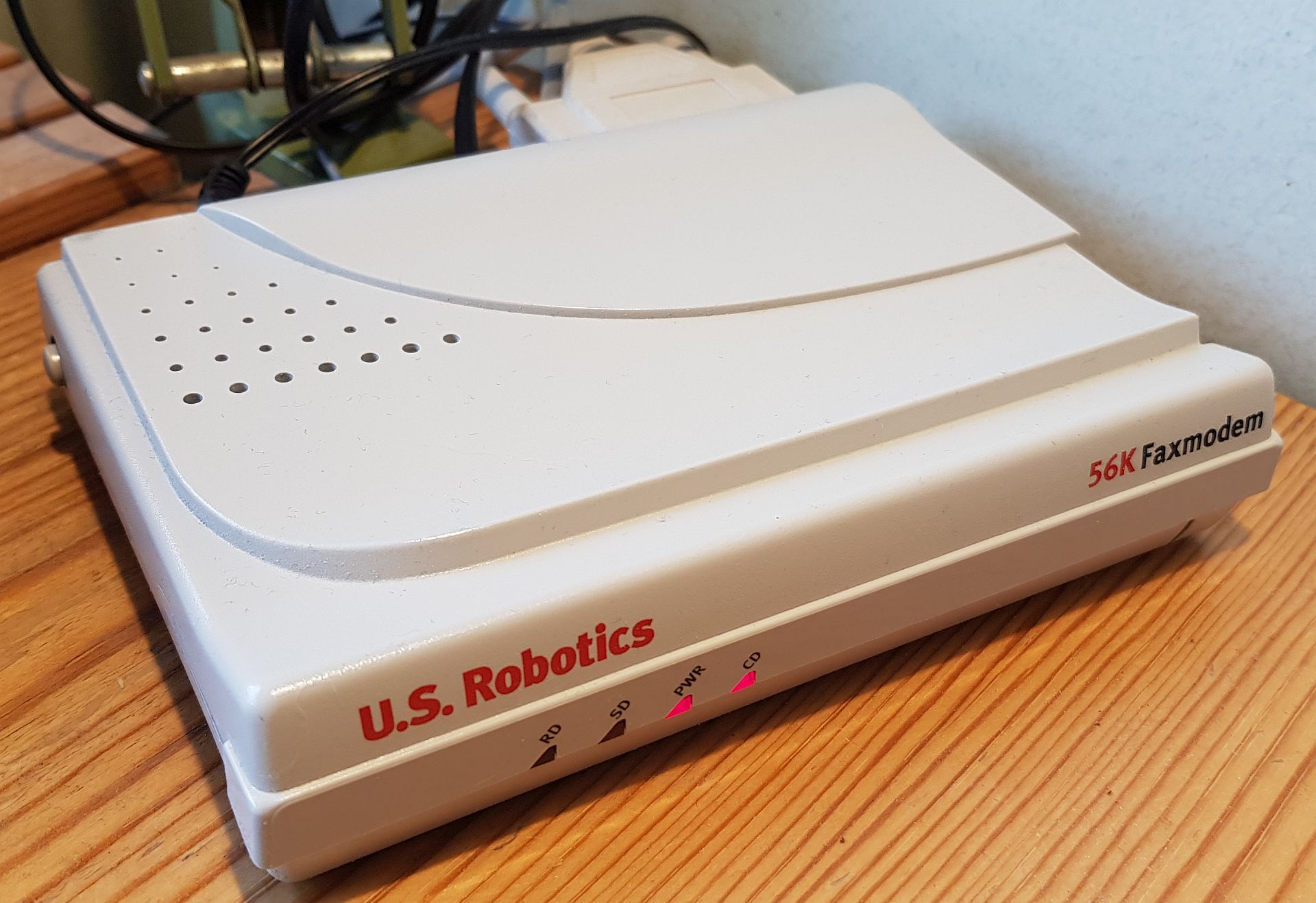 Aber zuerst brauchen wir neben der Software auch noch die passende Hardware. Ein 20 Jahre altes Modem U.S. Robotics 56k mit einer seriellen Schnittstelle besitzt einen Anschluss für die analoge 2-Draht-Telefonleitung. Dieses Modem lieferte in der Steinzeit des Internets den Zugang ins Netz über die Telefonleitung, als es noch kein DSL gab. Das alte Modem verbindet also den PC mit der analogen Telefonleitung über die serielle Schnittstelle.