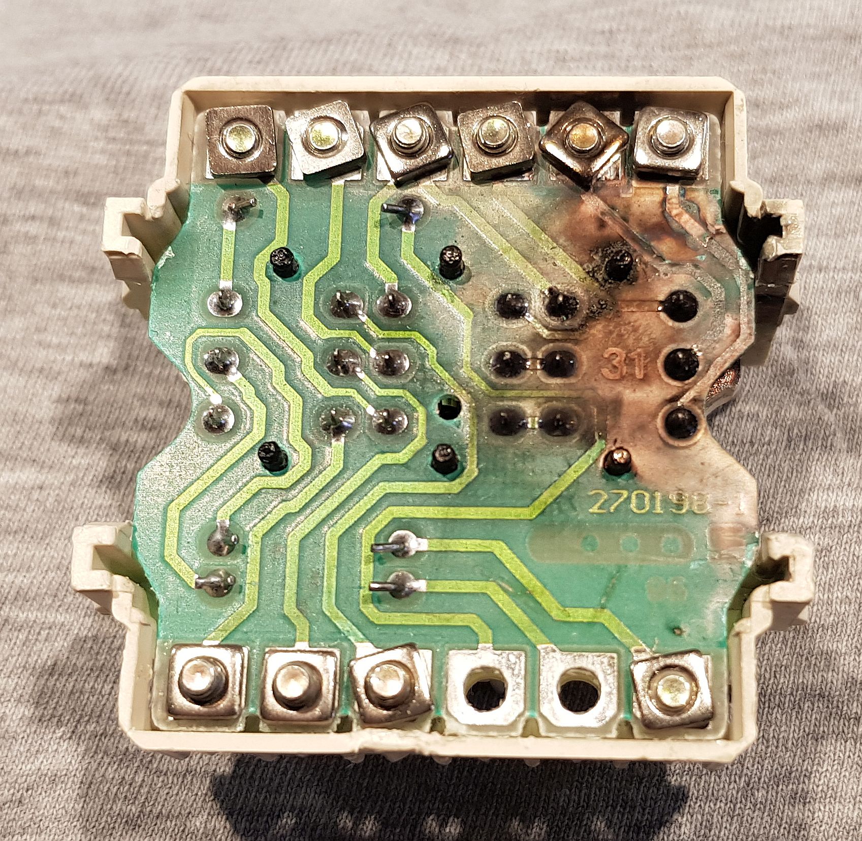 Das Faxgerät war mit einem Schutzleiter versehen. Da hat sich die Überspannung wohl einen Weg zur Erde durch die TAE-Anschlussdose und das Faxgerät gesucht. In der TAE-Dose sind Leiterbahnen weggebrannt: