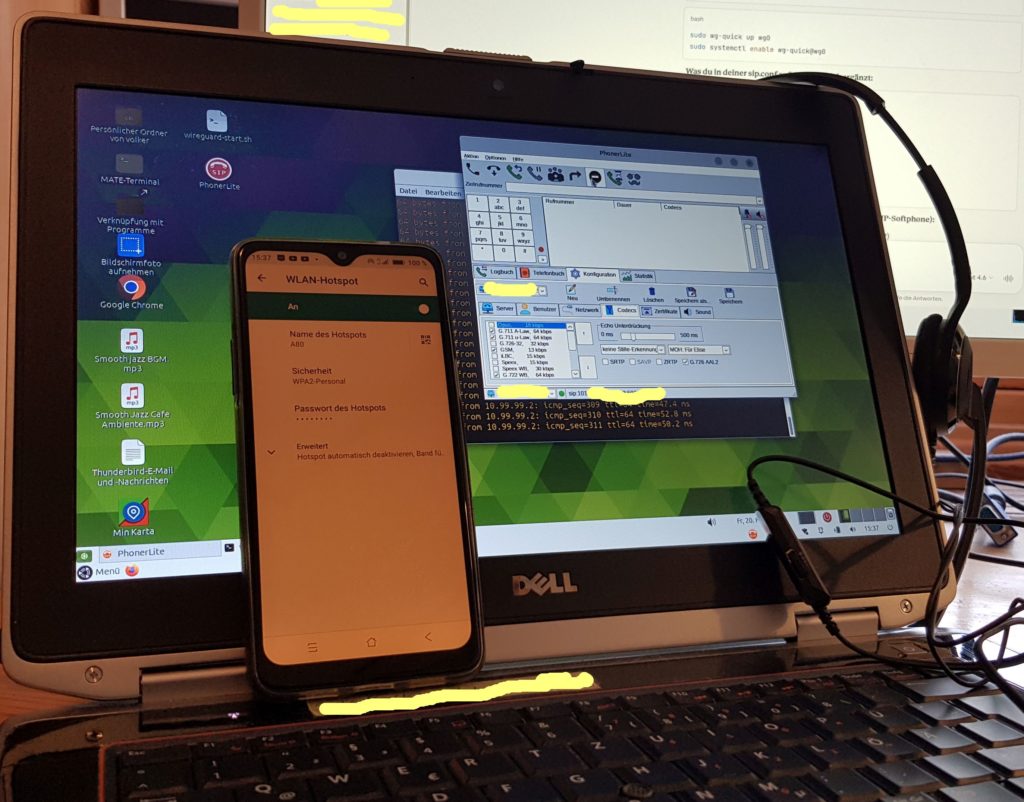 VPN-Telefonverbindung mit dem Softphone PhonerLite auf Ubuntu Mate. Mit Windows ginge es übrigens auch. Das Smartphone dient als WLAN-Accespoint zum Mobilfunk, um eine Situation von unterwegs realistisch zu simulieren.
