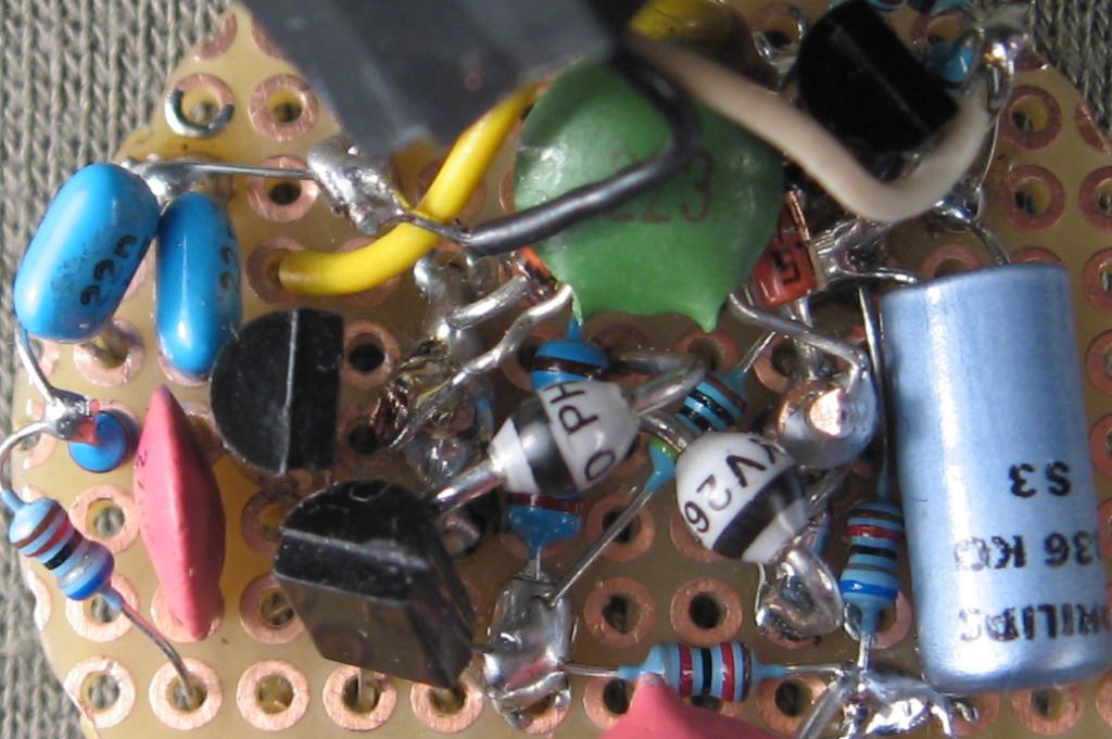 Sie klingt gut in dem schwedischen Dialog-Telefon. Vielleicht etwas zu laut. Aber das lässt sich ja leicht beheben. Zum Einsatz kamen nur bedrahtete Bauteile. Als Transistoren verwendete ich den 2N2222 und sein Komplentärtyp 2N2907. Mich wunderte, dass der Platz ausreichend war. Die Schaltung funktionierte fast auf Anhieb. Hatte nur die Masseverbindung zu den Dioden vergessen. Eine Fehlersuche ist bei dem engen Drahtverhau kein Vergnügen.