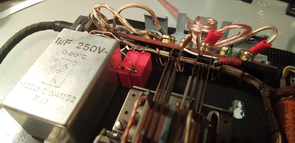 die beiden roten Blockkondensatoren sind schon durch die angelöteten Drähte ausreichend fixiert. Es handelt sich um ein Tischgerät mit schwerer Grundplatte zur Sicherung eines stationären Betriebs.