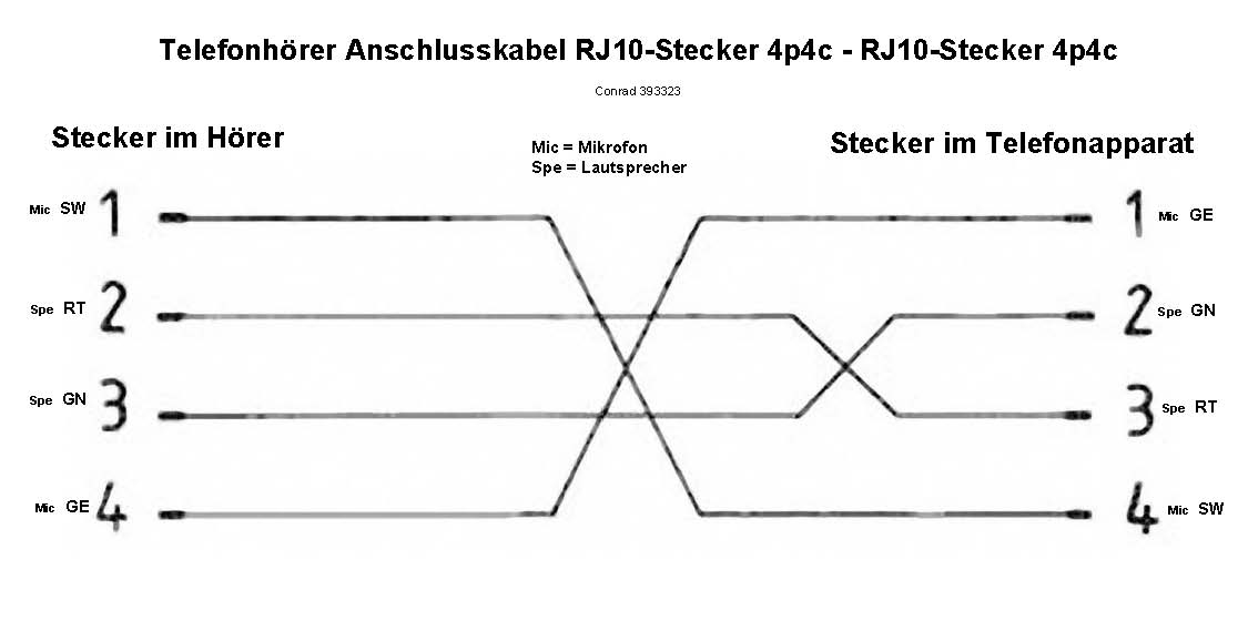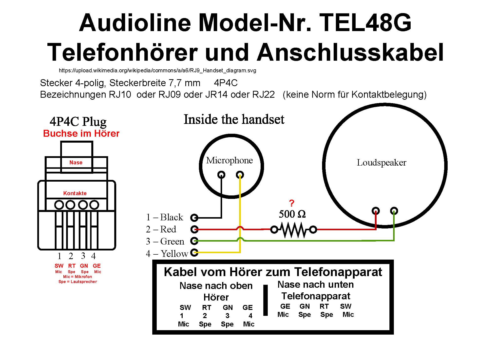 Bei einem analogen Tisch-Telefon (Audioline TEL48G) soll anstelle des Telefonhörers ein Headset angeschlossen werden. Der Telefonhörer und das Tisch-Telefon haben einen 4-poligen RJ09 Anschluss. RJ09 auch mit RJ9, RJ10 oder RJ22 bezeichnet. Die Pin-Belegung vom Telefonhörer und vom Tisch-Telefon ist mir bekannt. Die zwei inneren Kontakte sind der Lautsprecher, die zwei äußeren Kontakte sind für das Mikrofon. Siehe die Dateianhänge.