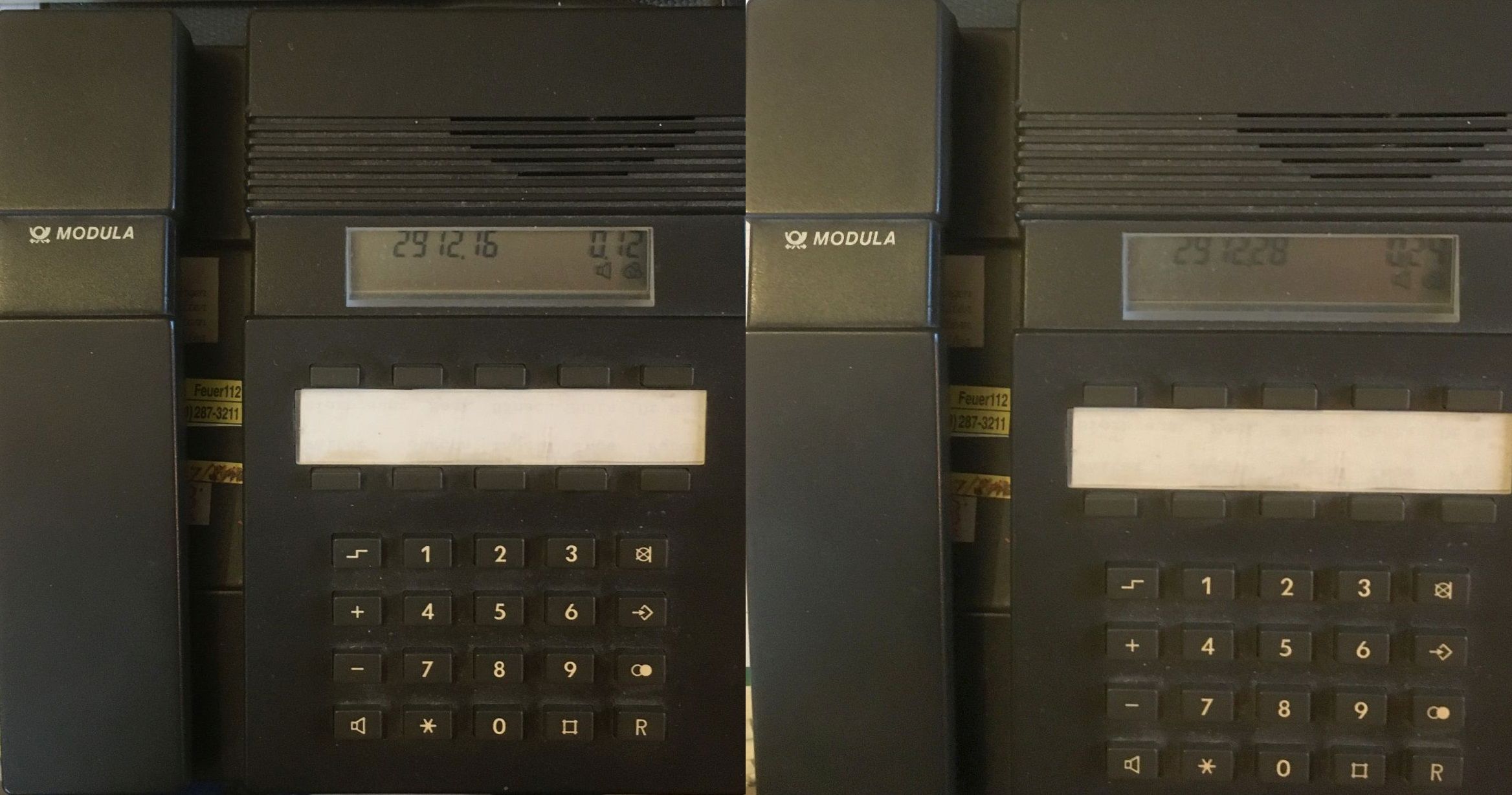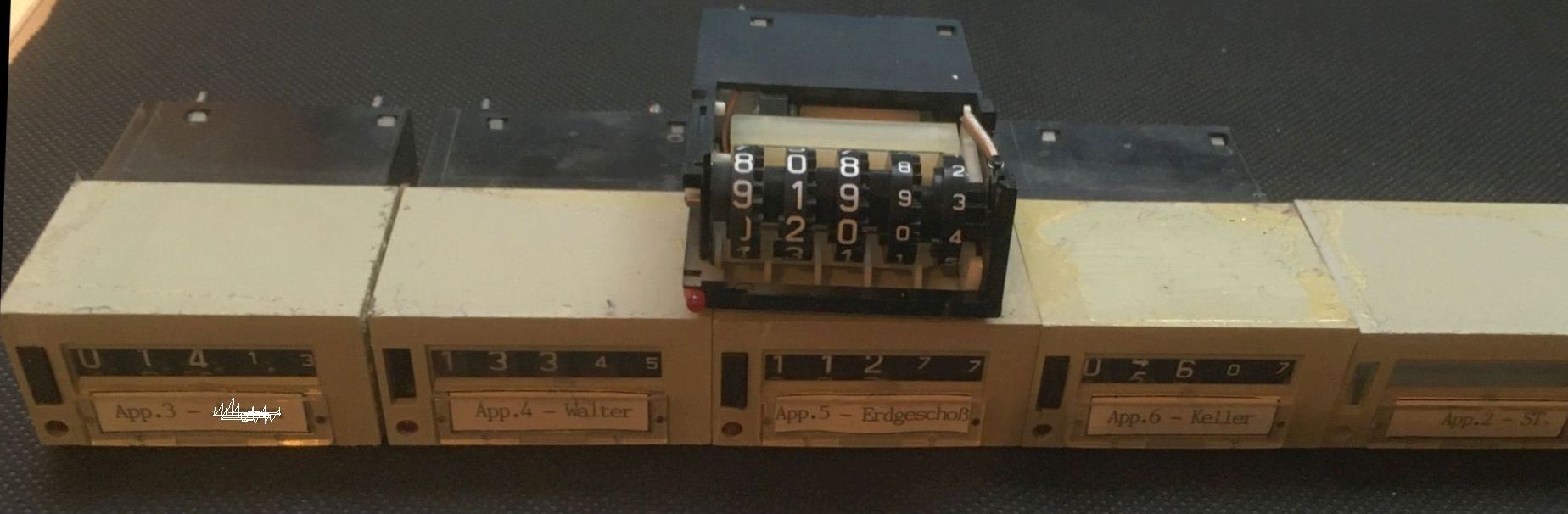 ich habe den Vorgang einmal mit einem Modula Telefon simuliert. Es klappte mit 10Vss auf 17,2 kHz (war noch so eingestellt für meine SAQ-Bastelei). Zuerst war nichts zu machen, weil das niederohmige Netzteil (auf nur 30V = Nebenstellenanlage eingestellt) die Impulse kurzschliesst. Aber mit einem Serienwiderstand von 1k Ohm (übliche Leitungswiderstände 500 ... 3000 Ohm) klappte es dann. Dann ist hier noch ein Satz mechanischer Gebührenzähler. Diese wurden in der Vermittlungsstelle eingesetzt und blockweise monatlich abfotografiert, um dann automatisiert die Rechnungen zu erstellen. Ich habe sie auch zuhause eingesetzt. Wie zu sehen ist, haben wir in unserem Haus 4037,52 DM "vertelefoniert" (Zeitraum unklar), und Walter hat am meisten gequasselt.