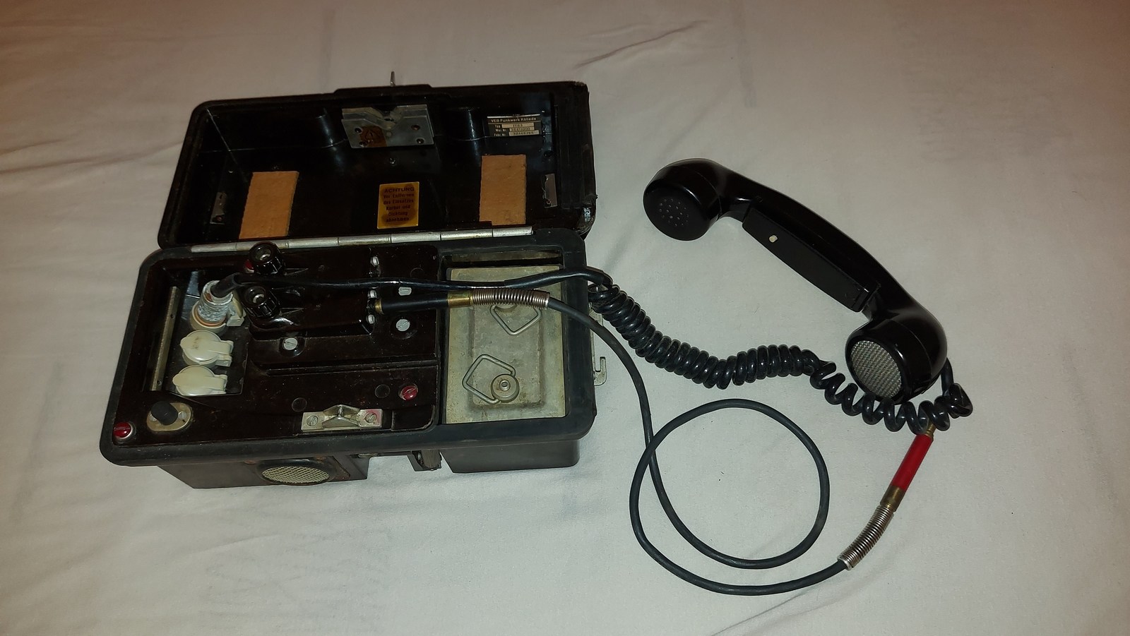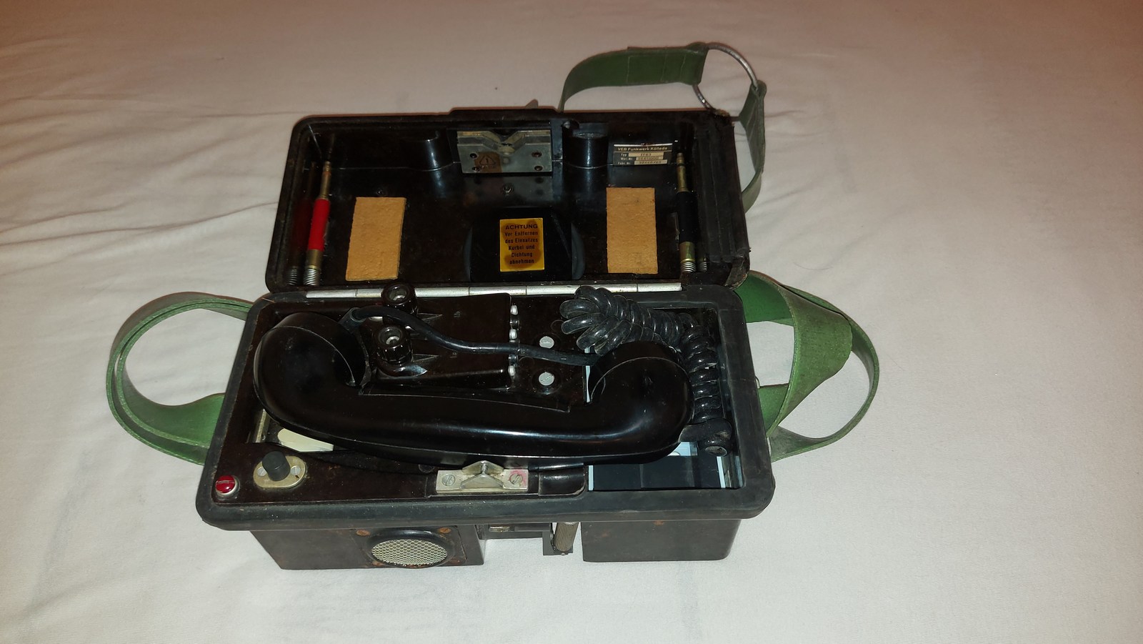 Heute hatte ich mal etwas Zeit und da dachte ich, das ich mal den Feldfernsprecher am öffentlichen Telefonmnetz teste. Ich weiß nicht, ob die Batterien bei Amtsbetrieb auch rein müssen, ich habe es einfach gemacht: