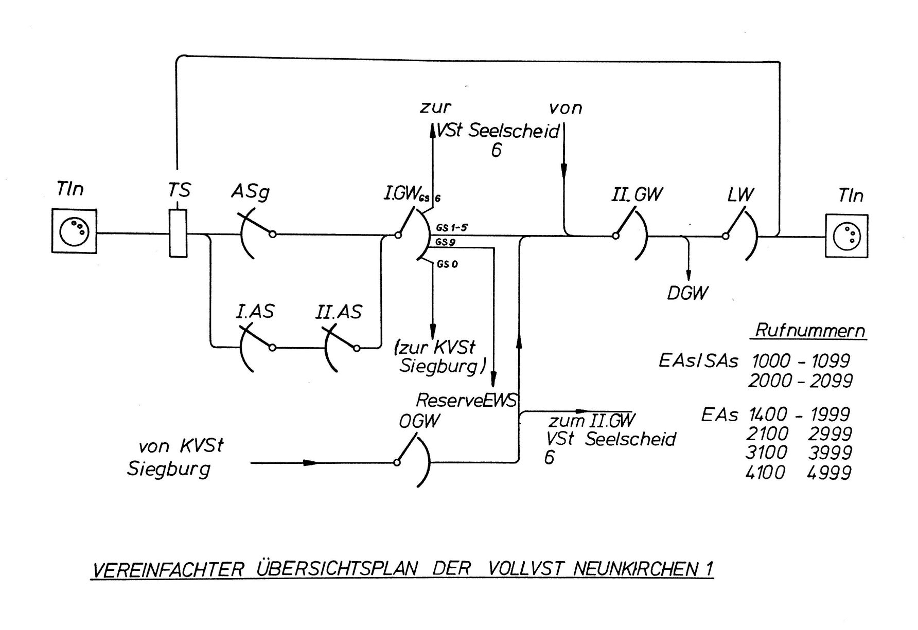 Tln = Teilnehmer TS = Teilnehmerschaltung AS = Anrufsucher GW = Gruppenwähler OGW = Ortsgruppenwähler KVSt = Knotenvermittlungsstelle DGW = Dienstgruppenwähler EWS = Elektronisches Wählsystem, damals scherzhaft "Es Wird Später" genannt EAs = Einzelanschlüsse SAs = Sammelanschlüsse