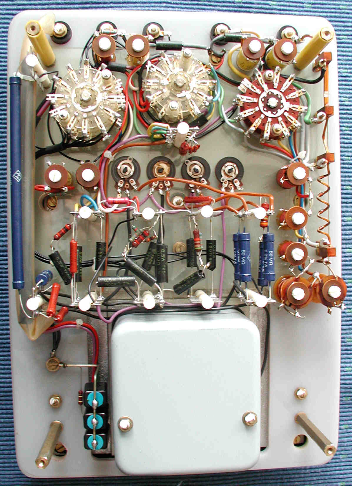 Mit den Kohlewiderständen, das könnte auch daran liegen dass Kohlewiderstände alterungsbeständiger sind, hier bin ich aber nicht sicher. Widerstände altern mit der Zeit und verändern ihren Wert. Deshalb hat Erich Marek auch viele Widerstände selbst hergestellt. Für Wechsel- oder Mischströme mit hohen Frequenzanteilen hat er solche Widerstände dann auch als eigenes Produkt verkauft - so ein normaler Widerstand hat ja je nach Frequenz einen anderen Widerstand.