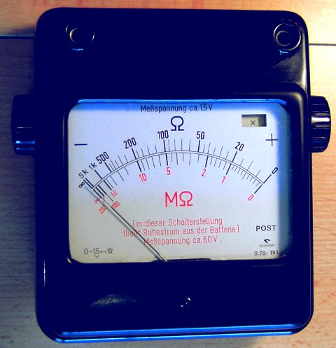 Jetzt noch das "Highlight" das Metrawid M. Es handelt sich um ein Ohmmeter mit mit einer Messpannung bis 500 V . Es erlaubt Messungen oder besser Ablesungen bis 1 Giga Für die Prüfung von alten Röhrengeräte C's genau richtig. Die Bereiche können an der Rückseite genauer gesehen werden. Einziges Problem ist die nicht mehr beschaffbare 9 V Rundbatterie, noch hält die alte. Leider macht der Autofokus der Digicam nicht so richtig mit, deshalb die nicht so tolle Bildqualität.