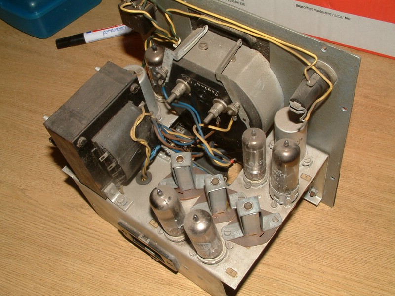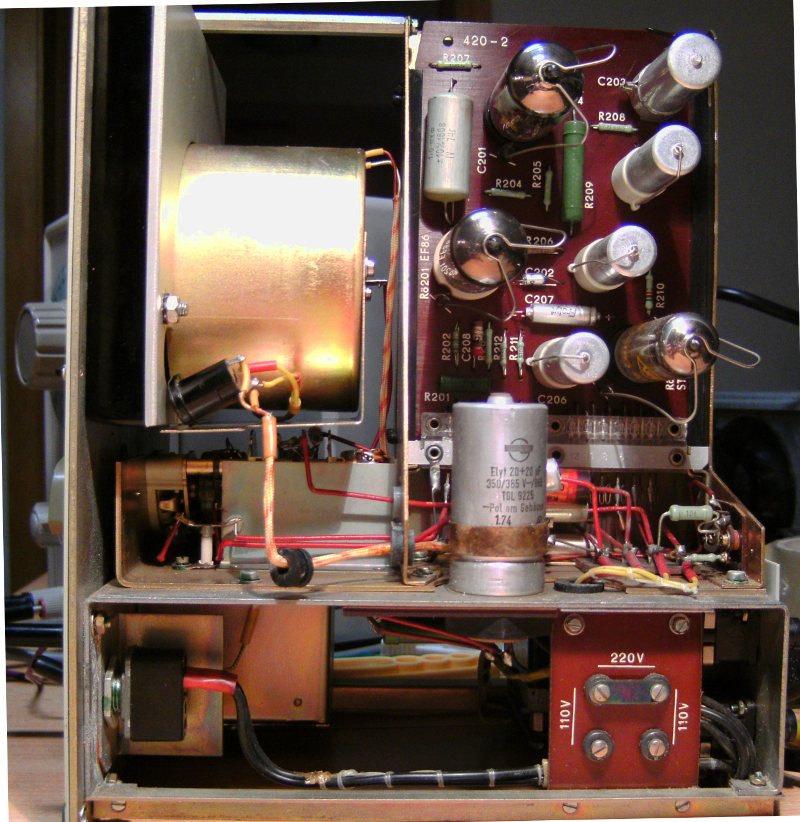 Die Beleuchtung beseht aus zwei Bajonettglühlampen, eine davon ist kaputt. Deren Fassung hab ich bis zur Beschaffung eines Ersatzes nicht wieder festgeschraubt. Jetzt will ich noch versuchen mit Hilfe eines Post-Tonfrequenzmessers, der noch einigermaßen frisch ist, eine Art Abgleich durchzuführen.