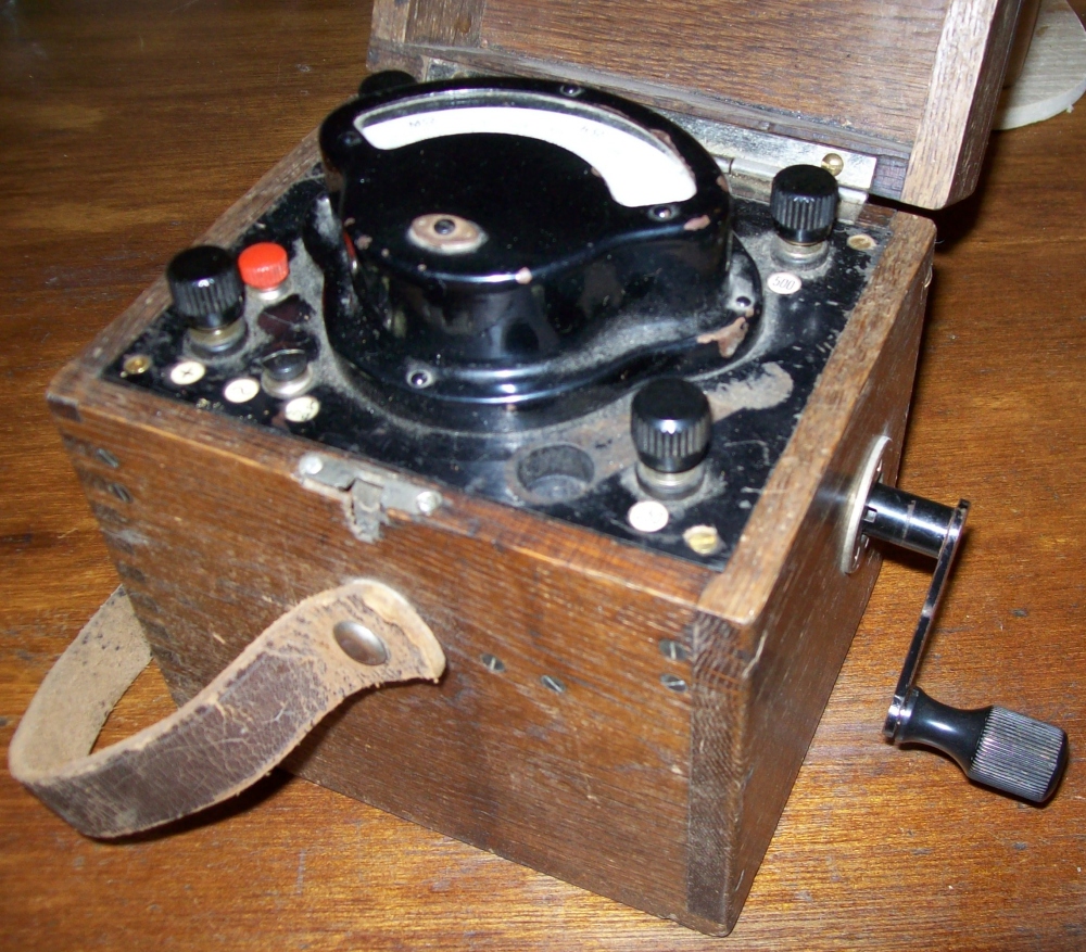 Ich habe einen Kurbelinduktor/Isolationswiderstandsmessgerät im Holzkasten, leider auch keine Herstellerbezeichnung oder Modell/Typ. Meinst Du sowas? Habe das Teil für 5,50 Euro in der Bucht erstanden: