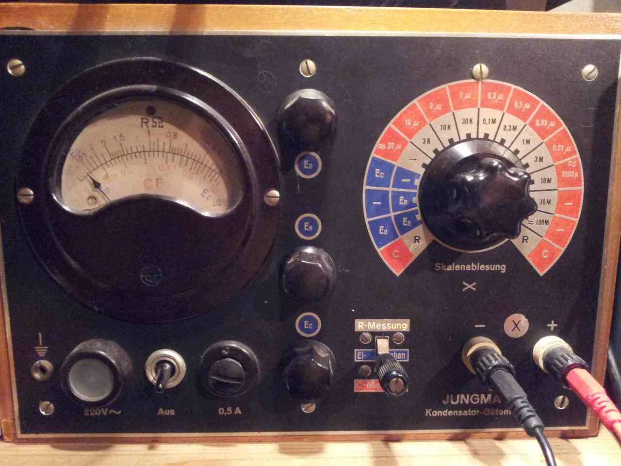 Mein "Schätzeisen", Elektromess RPG59. Hab ich mir wahrscheinlich selbst zerstört durch Einsatz von Kontaktspray im Drehschalter. Mal geht's, mal zeigt's die abenteuerlichsten Sachen an. Zum Glück mit Tendenz zu "geht", was ich den verdunstenden Sprayresten zuschreibe.