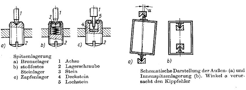 Ferner unterscheiden sich die Lagerungsarten hinsichtlich der Robustheit gegen mechanische Einflüsse sowie elektr. Empfindlichkeit. Eine Bändchen- oder Zapfenlagerung z.B. verträgt eher Stöße als eine Spitzenlagerung, dafür ist die Zapfenlagerung ob der höheren Reibung elektrisch unempfindlicher ggü. den beiden anderen Varianten.
