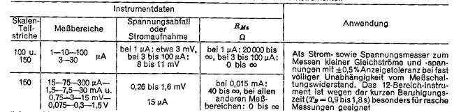 Nochmals zurück zum Galvanometer. Es gibt auch Zeigergalvanometer, die sind nicht ganz so empfindlich wie Lichtmarken oder Spiegelgalvanometer. Letztere sind wirklich reine Laborgeräte. Das ist das empfindlichste was passiv zu erreichen ist. Also wer daran Interessiert ist soll sich eines rausfischen. Die Industriegeräte sind feinste Präzisionsarbeit, ein Selbstbau oder besser Um oder Ausbau dürfte zuhause nicht möglich sein. Es gibt auch Vielfachmessgeräte, das dürfte das richtige sein. Hier mal ein Auszug was so Anfang der 60er auf dem Markt war bei den Geräten mit mehren Messbereichen.