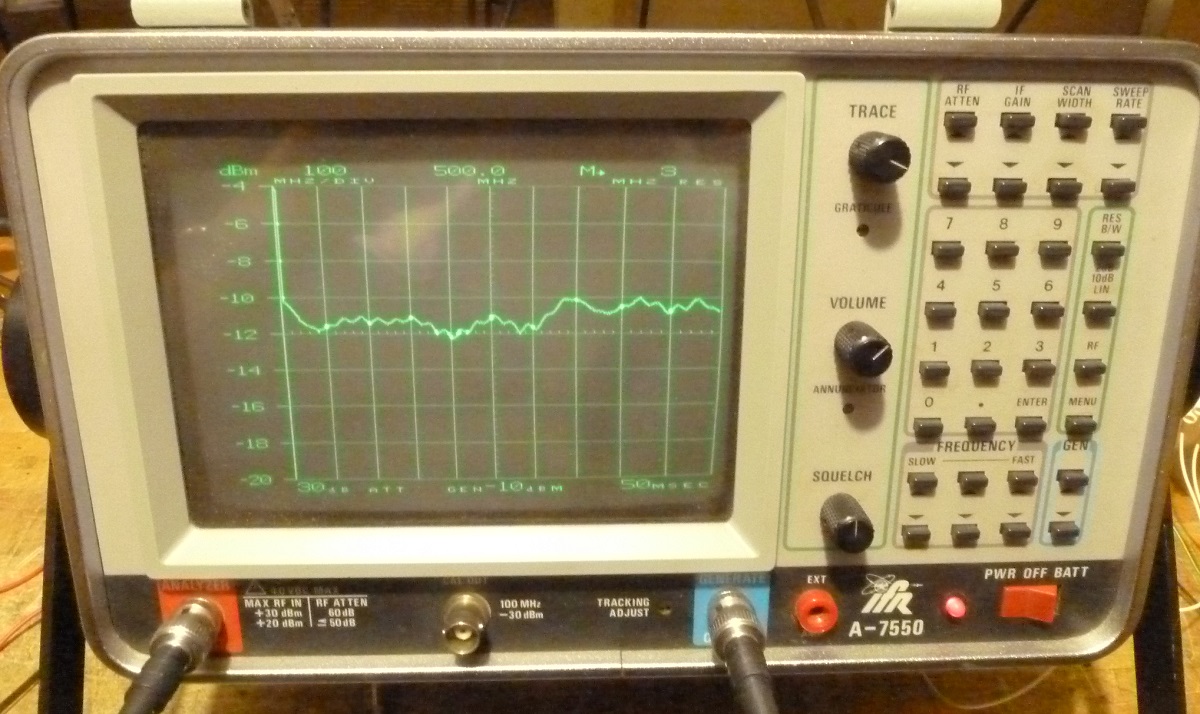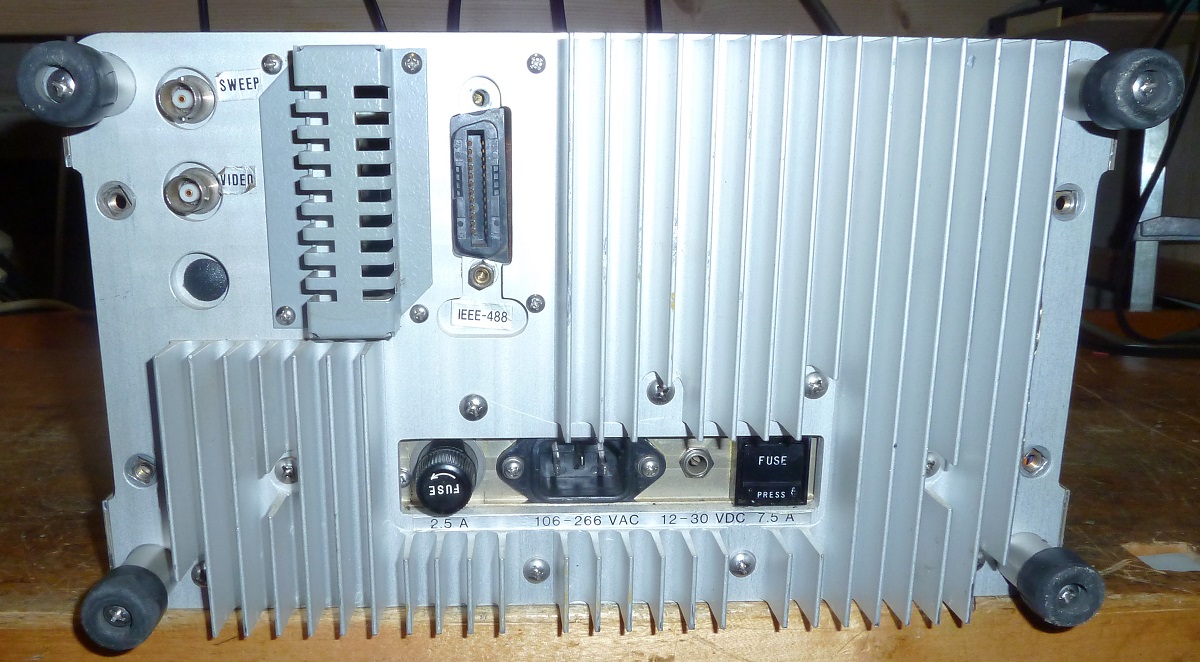 mir ist ein schöner Spektrum-Analyser der amerikanischen Firma IFR zugelaufen. Er misst von etwa 10kHz (offiziell 50kHz) bis 1GHz und hat auch einen Tracking-Generator sowie ein GPIB-Interface für die Fernsteuerung. Als weitere (leider nicht eingebaute) Optionen gibt es ein Quasi-Peak-Filter für EMV-Messungen, einen Demodulator/Messempfänger (FM schmal/breit, AM schmal/breit und SSB) sowie einen 12V-Bleiakku für Portabelbetrieb. Der maximal zulässige Eingangspegel ist mit 30dBm (1 Watt) recht hoch. Da er keinen Vorverstärker hat, ist der Rauschpegel eher hoch (-115dBm bei 300Hz Bandbreite). Gespeist wird er ab Netz (100..250V, 50..400Hz), internem Akku (optional) oder 12..30VDC. Der Verbrauch liegt bei etwa 50W, er hat einen Lüfter eingebaut.
