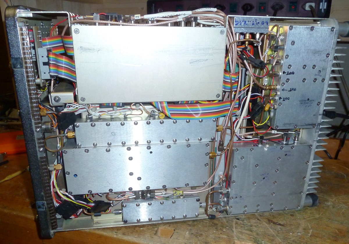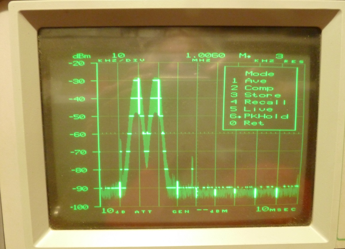Hier noch ein paar Zahlen: Auflösungsbandbreite: 300Hz, 3kHz, 30kHz, 300kHz, 3MHz Videofilter: keines, 30kHz, 300Hz Darstellung: 'live', Mittelung, Peak-Hold, relativ zu gespeicherter Referenzmessung 10dB/Div, 2dB/Div oder lineare Skalierung Scan-Breite: 1kHz..100MHz/Div in 1/2/5-Schritten oder Zero-Scan Referenzpegel: -90..+30dBm Tracking-Generator-Pegel: -75..0dBm Referenz-Ausgang 100MHz, -30dBm