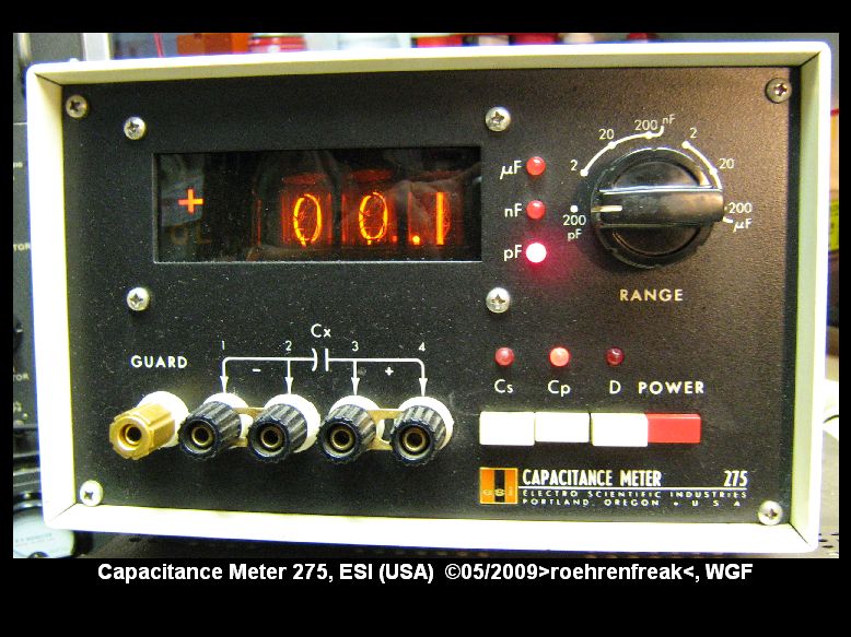 hier ein Capacitance Meter des ehemaligen US-Herstellers ESI (Electro Scientific Industries), Portland Oregon. Leider ist mir das Baujahr unbekannt, vermute um die 1970er. Unterlagen sind im www keine zu finden, emails mit den Nachfolge-Unternehmen brachten mich ebenfalls nicht weiter. Es hatte einen Aussetzfehler, welchen ich mittlerweile hoffentlich beseitigt habe, bisher arbeitet es jedenfalls wieder einwandfrei. Die Auflösung beträgt 0,1pF, bei 200µF ist nach oben Schluss. Das Gerät misst auch den Gütefaktor des Dielektrikums, bei alten Papierkondensatoren, wie sie massenhaft in unseren Röhrenschätzchen vorkommen, eine interessante Sache. Und die digitale Nixi-Anzeige hat obendrein ihr besonderes Flair...