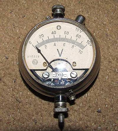 optisch ansprechendes Modell. Die Voltmeter waren ja in der Radio-Anfangszeit für den technisch begabten Hörer bei Verwendung von Baterie/Akku-betriebenen Empfängern notwendig. Viele dieser Radios hatten eingebaute Regler für die Heizspannung der Röhren. Um Überheizung bei vollen Akkus zu vermeiden, stellte man diese Regler täglich neu auf die richtige Heizspannung mit Hilfe dieser Taschenvoltmeter ein.