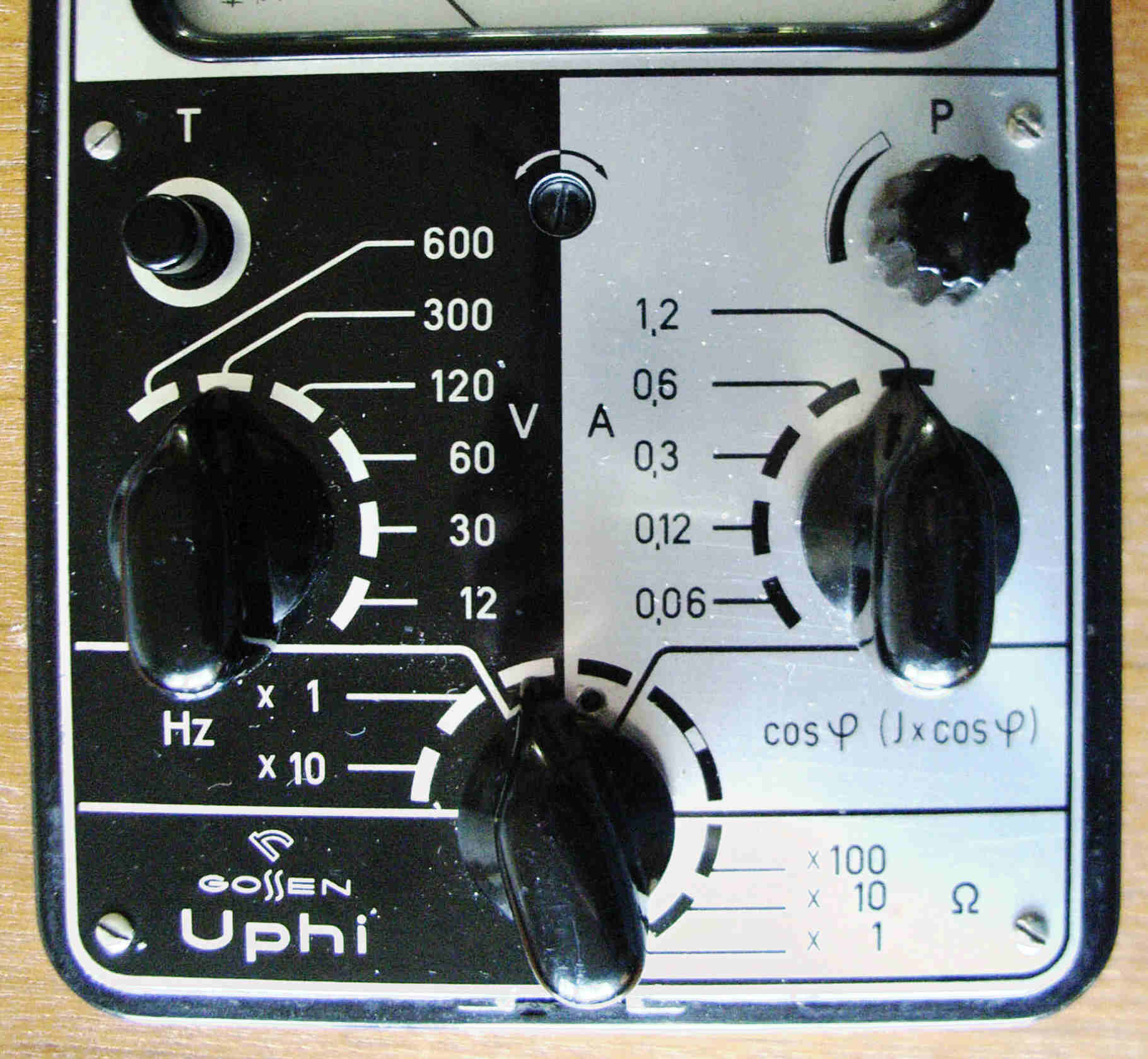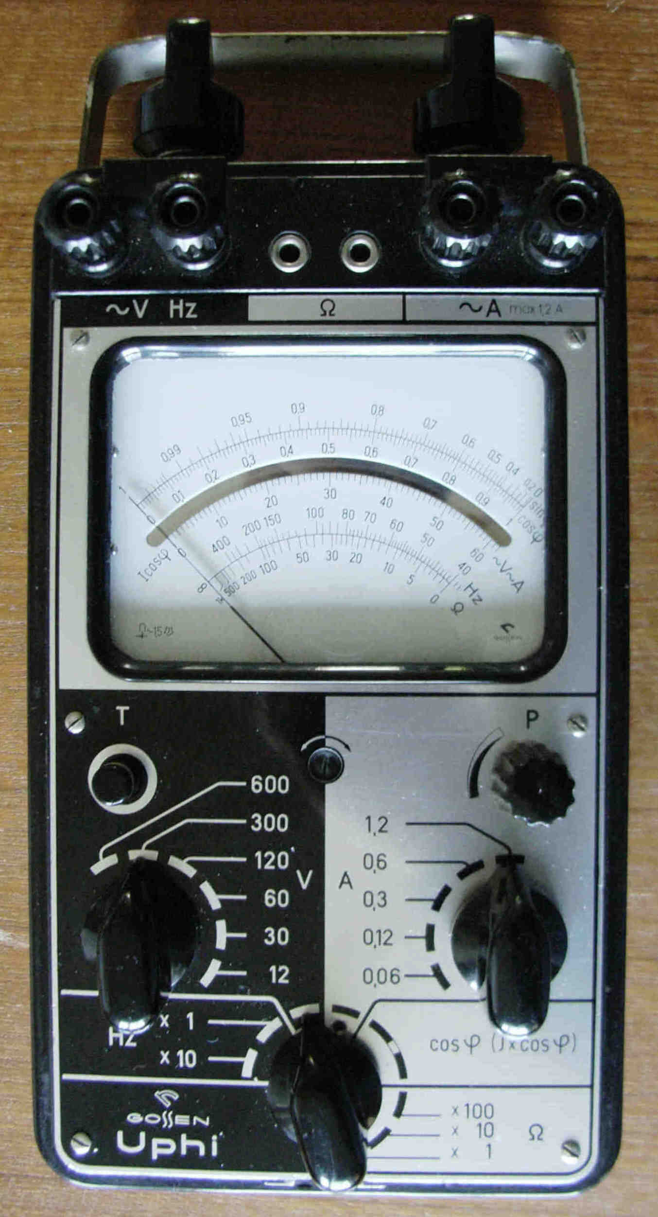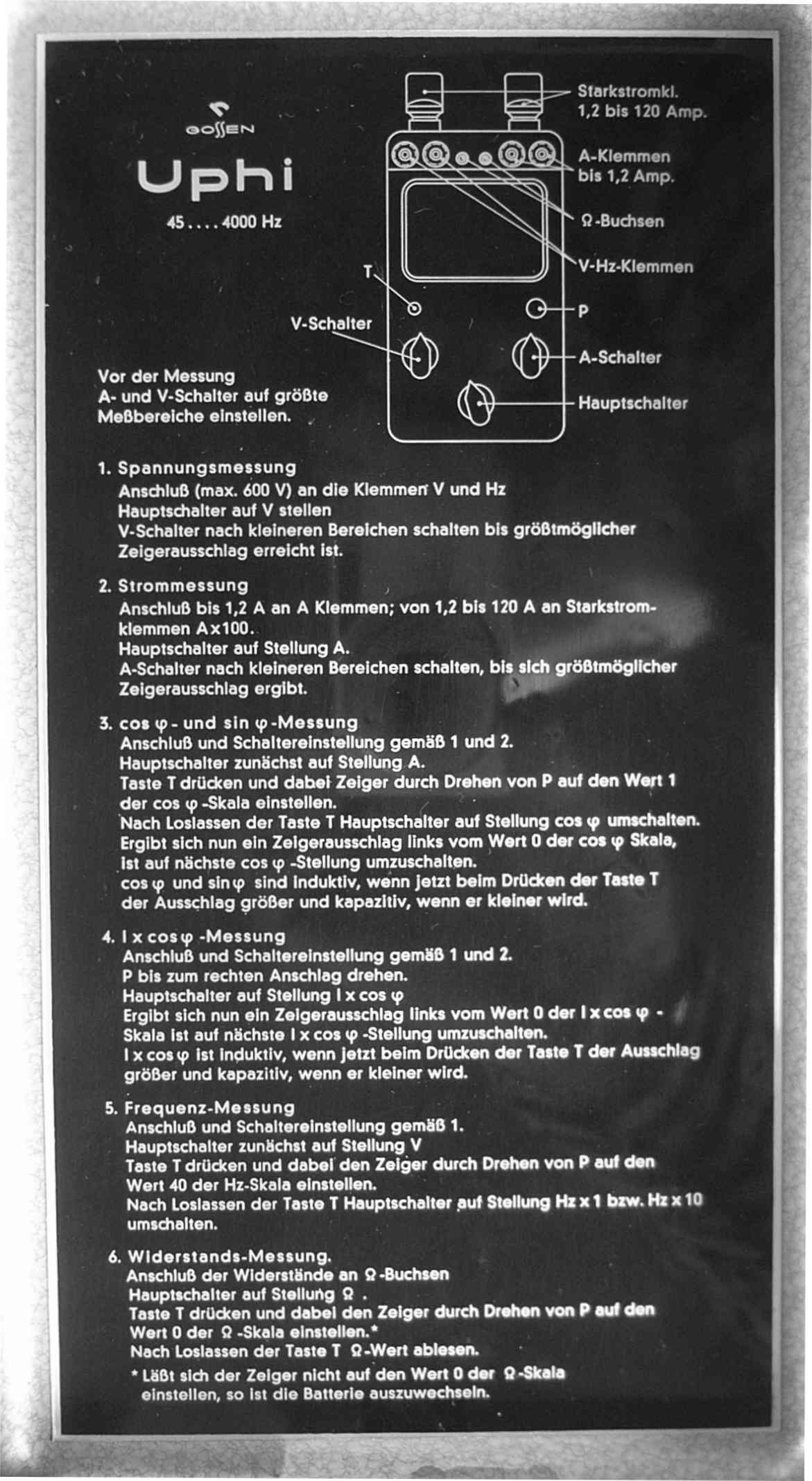 Das Uphi von Gossen ist ein reines Wechselstrom-Meßgerät. Es wurde auch von H+B unter dem Namen „Elavi Phi“ verkauft. Ich lernte es so um 1960 kennen und mögen. Zu der Zeit war in in einem Labor für Stromversorgung eines größeren Bremer Industriebetriebes als Mechaniker tätig. Mit dem Uphi können Wechselspannungen von 12-600V und -ströme von 60 mA bis 120A gemessen werden. Außerdem Widerstände und Frequenzen von 40 Hz bis 4kHz. Eine cos phi-Messung ist mit diesem Gerät ebenfalls möglich. Als ganz schön vielseitig dies Ding - für Starkströmer. Das Gehäuse ist montagegeeignet robust aus Stahlblech. Die Bedienungsanleitung ist unverlierbar im Deckel. Der Innenwiderstand ist nicht gerade hoch. Gemessen habe ich, weil eine Angabe am Gerät fehlt, bei 12V 24 mA Stromaufnahme = 41,6 Ohm/V, bei 60V 4,25 mA = 14,1 kOhm = 235 Ohm/V und bei 120V 2,2 mA = ca. 450 Ohm/V. Naja, es ist eben für Starkströmer gedacht. Schön ist, daß bei diesem Gerät Spannung und Strom gleichzeitig angeschlossen werden können und mit dem Meßartschalter zwischen beiden umgeschaltet wird. Mit demselben Schalter können Frequenz- und cos phi-Messungen geschaltet werden.