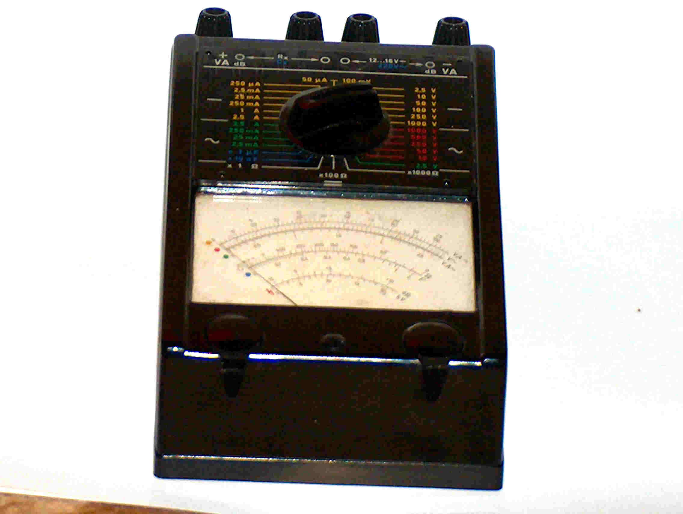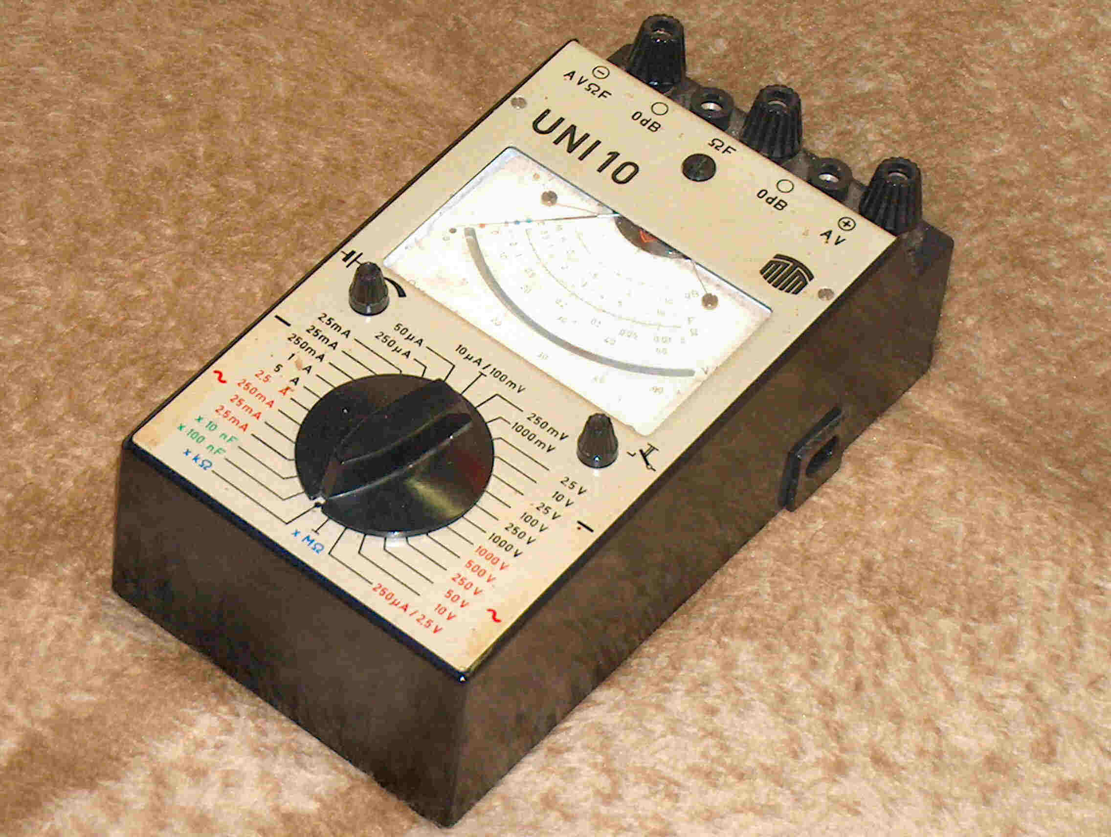Das UNI7 aus DDR Produktion 6 Messbereiche Wechselspannung von 2,5-1000V Wechselstrom von 2,5mA-5A Gleichspannung von 100mV-1000V Gleichstrom von 500µA-5A Und noch 2 Widerstandsmessbereiche von 0-10k/M Ohm