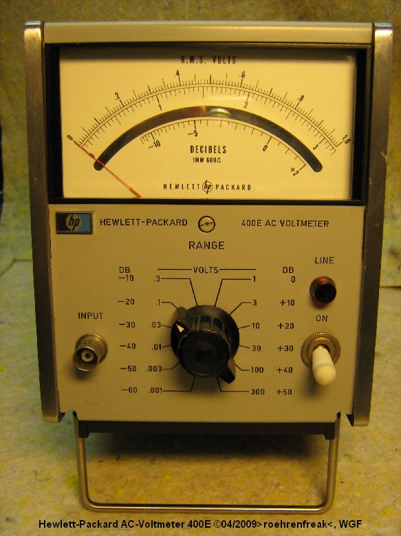 hier ein kleiner Leckerbissen der Analog-Messtechnik: Ein Hewlett-Packard 400E AC-Voltmeter. Es besitzt eine sagenhafte Empfindlichkeit von einem Millivolt Vollausschlag und "schafft" eine Frequenz bis zu 10MHz, die Eingangsimpedanz beträgt 10 MegOhm//21pF(1mV & 1V-Bereich) - 8pf (>3V-Bereich). Ein kleiner Netzteilfehler bewog den Vorbesitzer sich von diesem schönen Gerät zu trennen. Die vollständigen Unterlagen fanden sich im www, so daß die Reparatur sehr einfach war.