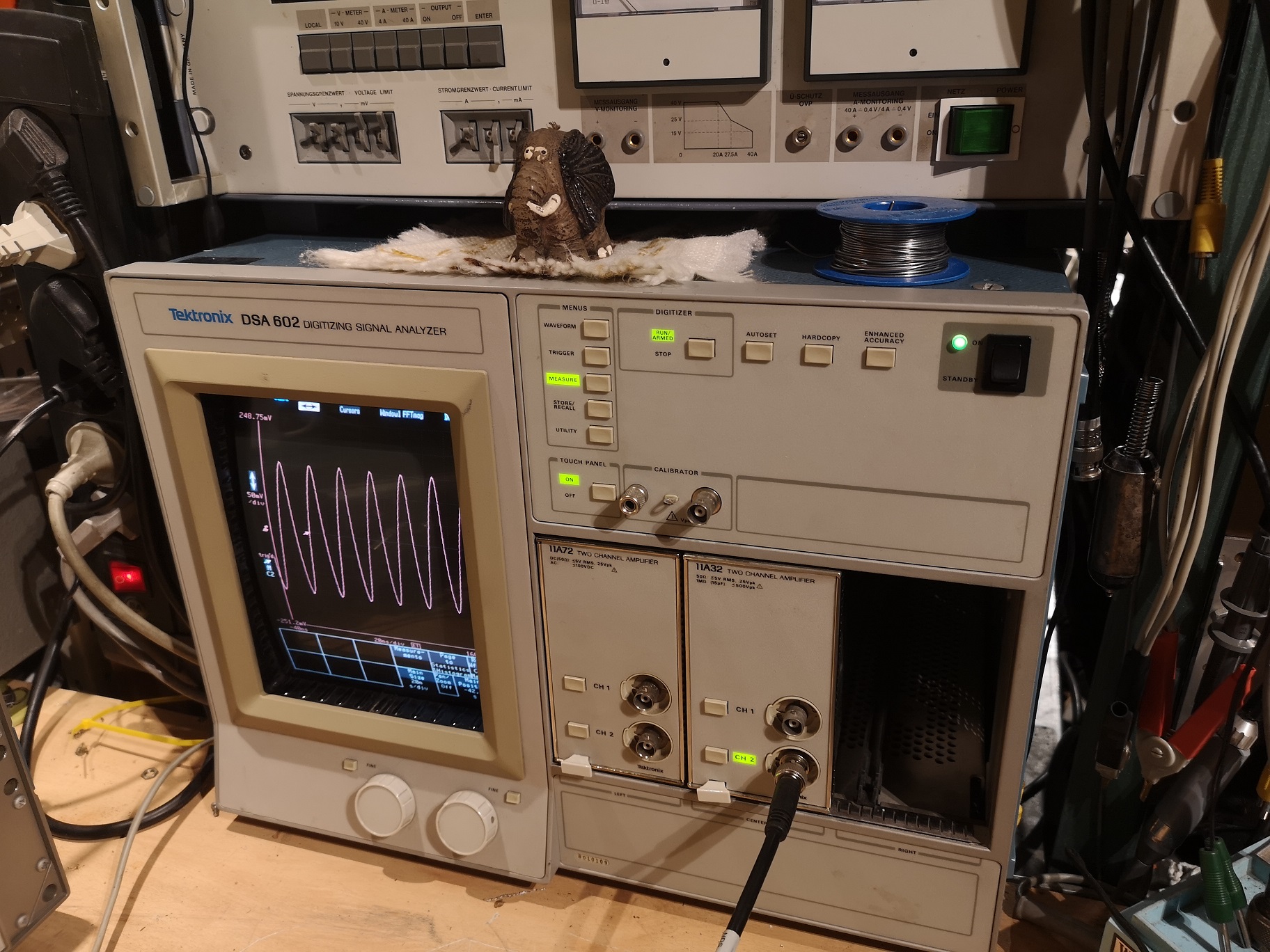 Dieser hier ist bestückt mit je einem zweikanaligen Einschub für 1GHz und für 400MHz Bandbreite. Was gibts zu bemängeln? DSA602 betreibt eine derart gründliche Selbstdiagnose, insbesondere "Enhanced Accuracy", daß ein Analogie in der Zeit die dieses System zum starten braucht schon die anstehende Messung erledigt hat...