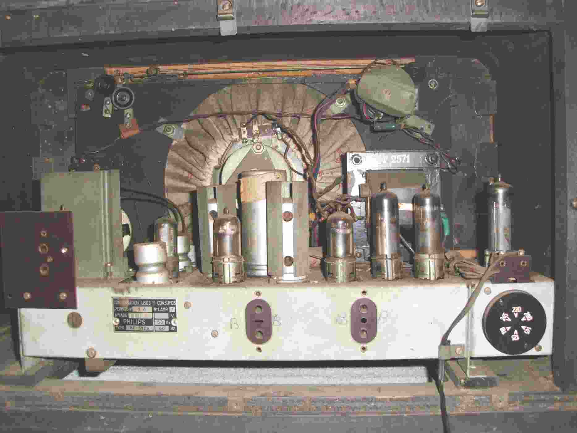 Dies ist ein Philips BCH 581 A. Der hat allerdings die Röhrenbestückung ECH21, 2 X EAF41, EM4, EBL21, AZ1. Die Empfangsleistung ist sehr ansprechend für ein Tischgerät dieser Art - es hat 4 Kurzwellenbereiche, Mittel- und Langwelle. Die Skala ist aus Kunststoff, nicht Glas. Eine Restauration des spanischen Geräts ist sicher lohnenswert, wenn auch das Gehäuse dort wohl nicht ganz so aufwändig (Intarsieren im BCH 581 A) gemacht ist. Dafür ist eine Gegentakt-Endstufe mit 2 x EL41 anstelle der EBL21 drin....