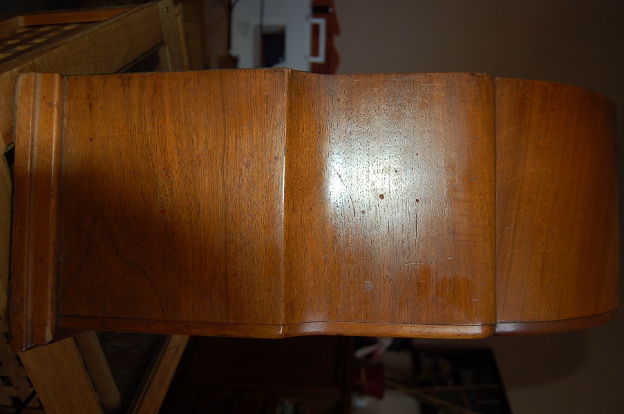 Der verschlissene originale Stoff, sowie die fehlenden Streben sind erhebliche Mängel, die nicht so einfach zu ersetzen sind. Das Gitter ist ungünstig zerbrochen, weil L-förmig umgedreht kommt noch so ein weiterer kleinerer 90° Bogen raus. Vom Gitter prinzipiell muss ein Abdruck gemacht werden, nachgegossen und das Teil dann eingepasst werden. Das ist Spezialistenarbeit für Leute mit viel Erfahrung! Stellt Euch vor die Harzfarbe stimmt nicht ganz, oder die Übergänge müssen tropfenweise nachgeharzt und verschliffen werden? Was dann? Das ganze Gitter überlackieren? Ist ne Möglichkeit, aber dann ist es eben nicht mehr original. Am besten was für Sammler die schon einen haben, dessen Gehäuse aber voll zerfressen oder aus dem Leim und Teile verloren sind. Zum Stoff: Ich habe 50er Jahre original Vorhangstoff da, der durchaus passabel an dem Gerät aussehen würde, aber es wäre dann doch nicht ganz das originale Muster und Beschaffenheit. Eben nicht mehr original. Ausserdem fehlt an der Seite das Hebelchen vom Schalter und von der runden Blende ist auch was abgebrochen. Wahrscheinlich ist auch die Lautsprechermembran defekt so wie es aussieht.