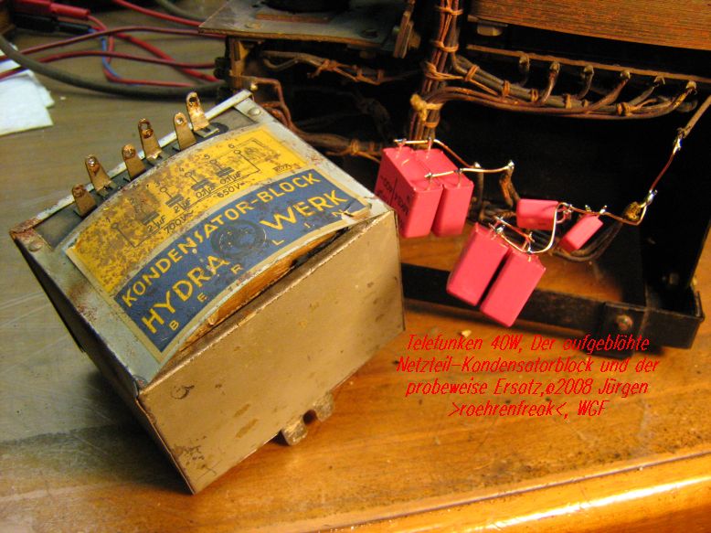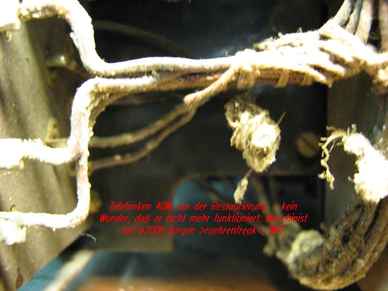 der Fall ist weitestgehend ausgestanden. Nach Revision des Netzteil-Kondensatorblocks wird nichts mehr unzulässig warm und kein übler Geruch verströmt, dafür ein recht munteres Spiel auf allen vier Frequenzbereichen. Die Rückkopplung setzt äußerst weich ein, der Klang ist recht hell bei doch durchaus zufriedenstellender Selektivität. Es fasziniert mich, daß dieses fast 80 Jahre zählende Radio so erfrischend sauber und stabil arbeitet. Nun folgen noch kosmetische Arbeiten am Gehäuse damit auch das Äussere so ansprechend wie das Innenleben daher kommt. Nach getaner Arbeit werde ich euch diesen wunderbaren TFK 40W im Bild vorstellen. Schade, daß wir keine Audioclipps dazu präsentieren können - das wäre doch das I-Tüpfelchen für ein Radioforum wie diesem hier, oder?