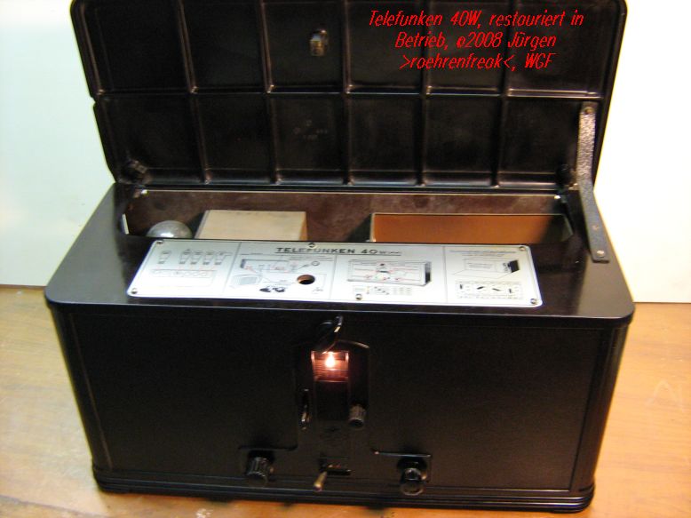 Zuerst meinen Glückwunsch zum erfolgreichen Abschluß der Wiederherstellungsarbeiten am inneren Teil des Radios. Voraussetzung für den Empfang mit solchen Geräten ist ja, daß die damals verwendete Sendetechnik in ihren grundlegenden Parametern noch heute eingesetzt wird. Bleibt nur zu hoffen, daß die Umstellung auf digitalen Sendebetrieb nicht all zu schnell erfolgt. Ein Transport von analogen AM- Rundfunksendern über Kabel, wie es beim Fernsehen praktiziert wird, ist ja sehr unwahrscheinlich. Was mich immer wieder an alten Röhren fasziniert, ist die Dichtigkeit an den Drahtdurchführungen. Wie man das mit dem damaligen Kenntnisstand geschafft hat, wird wohl ein Rätsel bleiben. Selbst in den siebziger Jahren war bei der Fertigung von Halbleiterdioden in Glasverkappung das Thema "Dichtigkeit" noch ein Problem. Bleibt mir noch, Dir bei der äoßeren Restaurierung des Gerätes einen ebenfalls befriedigenden und erfolgreichen Abschluß zu wünschen.
