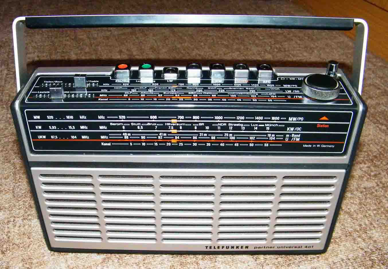 Heute hat es geklappt. Habe auf dem Flohmarkt einen "TELEFUNKEN partner universal 401" erstanden. Er ist in einem recht ordentlichen Zustand - wie die Bilder auch zeigen - ist noch ungereinigt, wie vom Markt mitgebracht. Nach dem Reinigen der Batteriekontakte und dem mehrmaligen Drücken der Bandtasten spielt er auf allen Wellen. Die Grüne Luxemburgtaste liegt im KW-Bereich 49m - die genaue Frequenz weiß ich jetzt nicht gleich. Geöffnet habe ich den noch nicht , aber da sind wohl nur die beiden Schrauben an der Seite zu lösen - oder? - habe noch nie ein Westradio geöffnet - welch Plamage -, sammle von Taschen- und Kofferradios eigentlich nur Geräte die es auch in der DDR zu kaufen gab. Aber ich hoffe doch , daß da noch TFK drin ist. Nur schade das auf der Frequenz der Grünen Taste kein Sender zu empfangen ist.