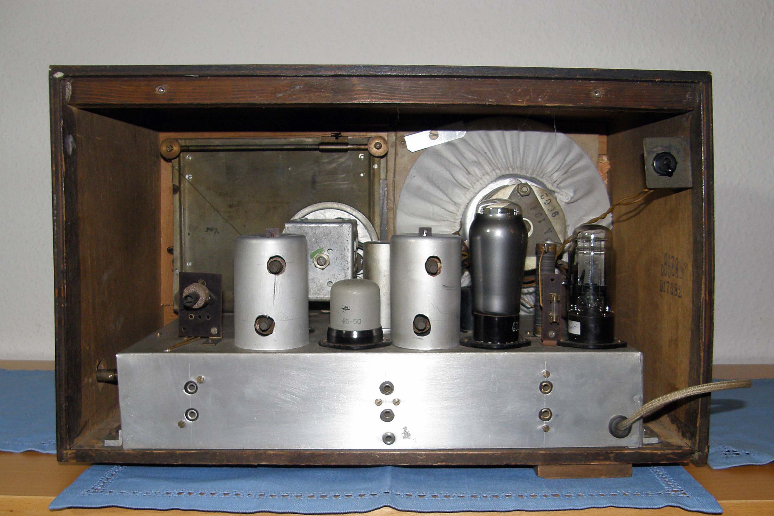 mein Lieblingsradio bekam ich kürzlich von einem guten Freund (dem besten, den man haben kann) für einen Gefallen, den ich ihm tat, geschenkt. Es stammte aus dem Nachlaß seines in den achtziger Jahren verstorbenen Großvaters, der in Berlin-Friedrichshain in der Kopernikusstraße ein privates Radiogeschäft (Radio-Krusch) betrieb. Man konnte dort Radios usw. kaufen aber das Hauptgeschäft war die Reparatur von Radiogeräten und das Aufladen der Anodenbatterien, die man in den fünfziger und auch noch teilweise in den sechziger Jahren für die Kofferradios brauchte. Er führte dieses - und das war eigentlich die Ausnahme - nicht verstaatlichte Geschäft bis in die siebziger Jahre. Ich vermute ganz stark, dass es sich bei diesem Radio um einen Eigenbau mit Teilen der Fa. Roland Brandt Berlin handelt. Die Ausführung des Chassis, die ausgesägten Löcher an den Alu-Abschirmungen und die einfach gestaltete Rückwand lassen mich das vermuten. Eine andere Variante wäre, dass es sich um ein Meister- bzw. Gesellenstück, das von dem o.g. in den vierziger Jahren bei der Fa. Brandt gebaut wurde, handelt. Allerdings weiß ich nicht, ob so etwas üblich war. Der Steg in der Mitte zwischen dem Lautsprecher und der Senderskala ist keineswegs, wie man vermuten könnte, aus Holz. Es handelt sich um ein U-förmig gebogenes Blech, das mit einer Art Aufkleber in Wurzelholzoptik versehen war. Leider ist das Original dieses Aufklebers zerbröselt (es fühlte sich wie altes Filmmaterial an) und ich musste es durch einen Ausdruck meines Druckers ersetzen. Es gleicht keinem der Radios der Fa. Brandt, die ich im Internet gesehen habe. Ich vermute, dass es kurz nach dem 2. WK hergestellt wurde, denn es ähnelt von der Ausführung her den Vorkriegsmodellen der Fa. hat aber schon die Senderskala auf der RIAS-Berlin (roter Pfeil auf dem Foto) steht, und dieser Sender (Rundfunk im amerikanischen Sektor) wurde erst 1946 gegründet. Es würde mich freuen, wenn diese kleine Abhandlung jemanden interessiert hätte und wenn ich ein paar Meinungen dazu hören könnte.