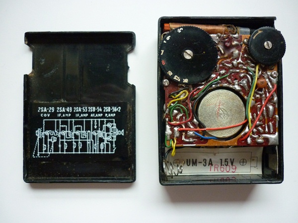 Was ist das besondere daran? Neben der sparsamen, optimierten Schaltung die Lederhülle mit den Druckknöpfen! Im Bildhintergrund oben ist das Modell Music-Transistor-Boy zu sehen. Ich habe die Transistor-Box defekt aus der Bucht gefischt und - Gott sei Dank - waren alle Transistoren noch intakt und original. Jetzt empfängt und spielt sie wieder recht ordentlich, solange die Mittelwelle noch Sender hat...