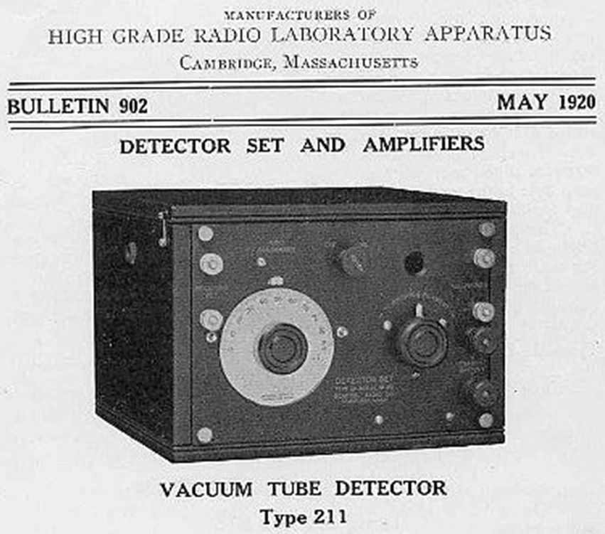 Es steht für mich ausser Frage, dass man wegen des Entwicklungsvorsprungs nur in den USA fündig wird. Nach dem momentanen Stand meiner Recherche ist es der "Vacuum Tube Detector Type 211" der General Radio Company aus Cambridge, Massachusetts. Das Gerät wird aus dem Jahr 1919 vermutet (RM) und lässt sich im Bulletin 902 im Mai 1920 ansehen: