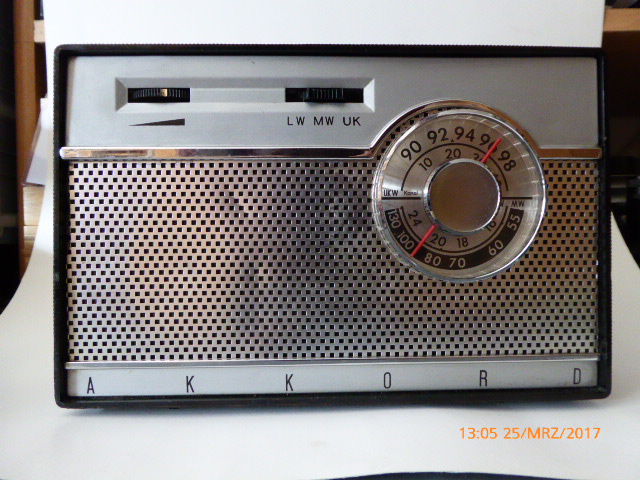 Da ich dieses Kofferradio mal als junger Mann besessen hatte, viel es mir in der Bucht auf und ich konnte es günstig kaufen. Jetzt suchte ich meine Bildergallerie aus den 60er Jahren durch und wurde fündig. Nomen est Omen: In der ersten gemeinsamen Wohnung in Offenbach (Main) im Jahr 1968, also dem Jahr in dem ich meine Schulkammeradin zur Ehefrau nahm - und sie mich zum Ehemann....(Das dauert jetzt 48 Jahre an) hatte ich das Kofferradio auf dem Tisch stehen. Bild ist zwar die Rückseite, aber eindeutig das Akkord Filou Export (U-M-L) Die Personen habe ich wegen der Persönlichkeitsrechte etwas Bearbeitet.Da meine Frau mit der Agfa Box auch umgehen konnte, bin ich auf dem Bild. (Der unretuschierte) Das Radio im Vordergrund.