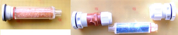 Natürlich hat die mittlerweile eingedrungene Luftfeuchtigkeit aufgenommen (dafür ist sie ja da), die blaßrosa Farbe ließ erkennen, dass das Silicagel mit dem einem Indikator versehen ist ("Blaugel") Normalerweise geschieht die Regneration bei nict über 120°C im Werkstattofen oder über dem Lötkolben, hier besteht das Gehäuse aber aus PVC.