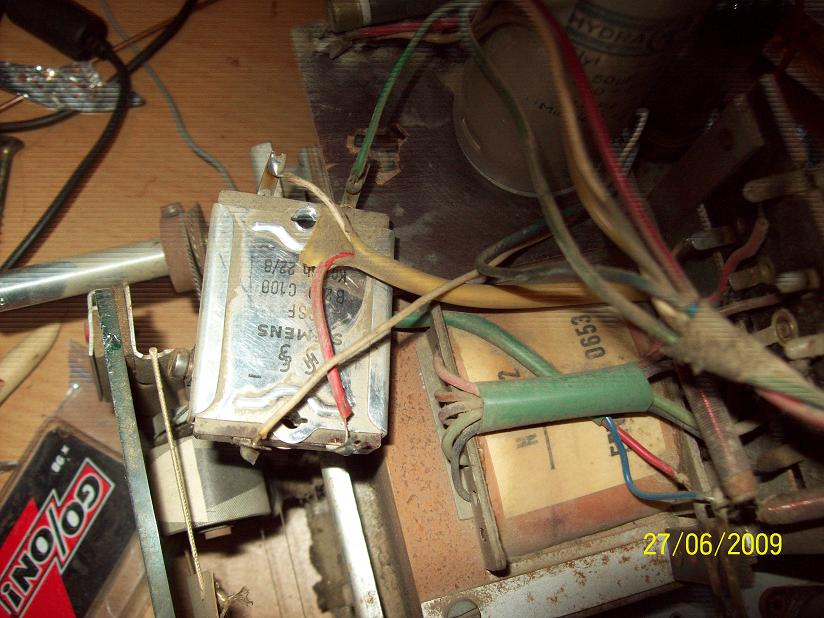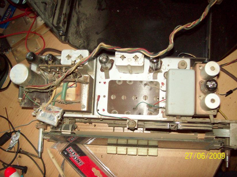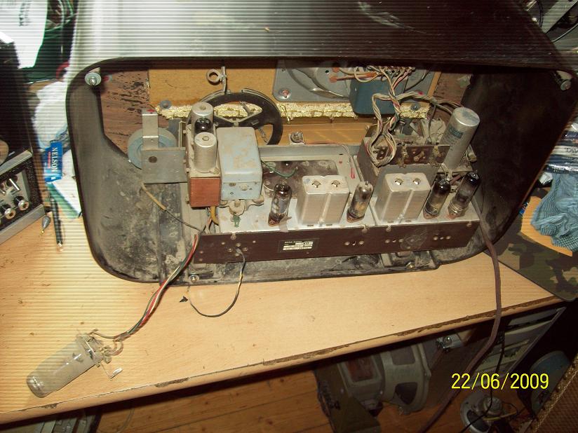 Gehäuse: OK, hat aber Farbspritzer. Das krieg ich hin. Rückwand: sehr gut erhalten. Dreck und Staub: jede Menge ... Betrieb: erst heizt er, dann brummts ... der Gleichrichter ist vermutlich hinüber. Front-Stoff: guter Zustand.