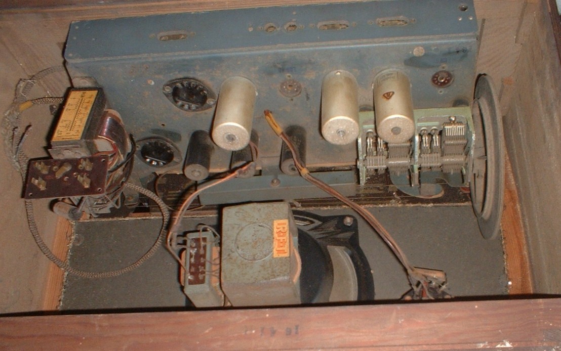 Dazu möchte ich anmerken, daß diese Schaltung relativ neu war und eher nicht zur Kombination von Stahlröhren und Allglasröhren paßt. Unüblich ist auch die Montage. Die Skalenscheibe ist nicht am Chassis montiert, sondern mit 3 Metalllaschen am Holzgehäuse. Für Maßtoleranzen sind die Löcher für die Regler waagerecht oval vergrößert. Weitere urheberrechtlich geschützte Bilder des Objektes. Die Skalenscheibe am Wellenschalter, UKW reicht von 0-25 linear geteilt. Die Unterlegscheiben der Chassisbefestigung sind Teile von Typenschildern! Die Bruchstücke der Skalenscheibe links vom Lautstärkeregler von der Rückseite aus , wo ich eine Radiobezeichnung vermutet hatte, statt dessen der Herstellervermerk-Aufdruck. Weitersuchen! MfG Florianska