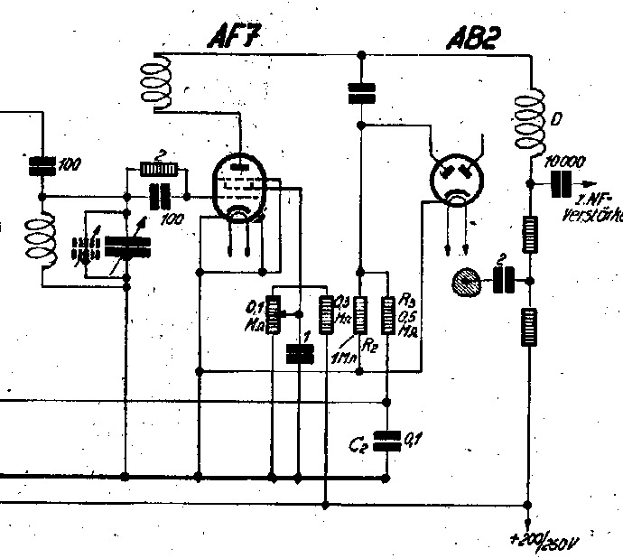 Um einen anderen Audion - Beitrag nicht zu unübersichtlich zu machen ein Schaltungsausschnitt eines Zweikreisaudion mit Gittergleichrichtung zu NF Erzeugung und Diode zur ALR Spannungserzeugung. Die ALR Spannung geht zum Gitter einer HF Regelröhre (AH 1) wo auch der erste Schwingkreis ist. Man könnte natürlich auch eine Abstimmanzeigeröhre mit hinzufügen. Also gab es doch so eine Schaltung, aber ohne Mag. Auge. Eine EAM 86 könnte hier gut passen, aber die gab zu Zeiten dieser Röhren noch nicht.