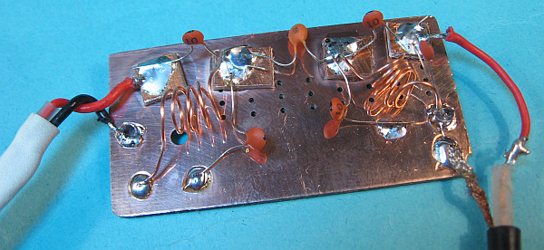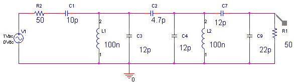 Entworfen mit ADEE-Filterdesign, einem Spulenberechnungsprogramm, PSpice und dann mit dem FA-Netzwerktester gemessen. Das Bandfilter braucht man vor dem MMIC. Ohne Filter am Eingang ist er überfordert.