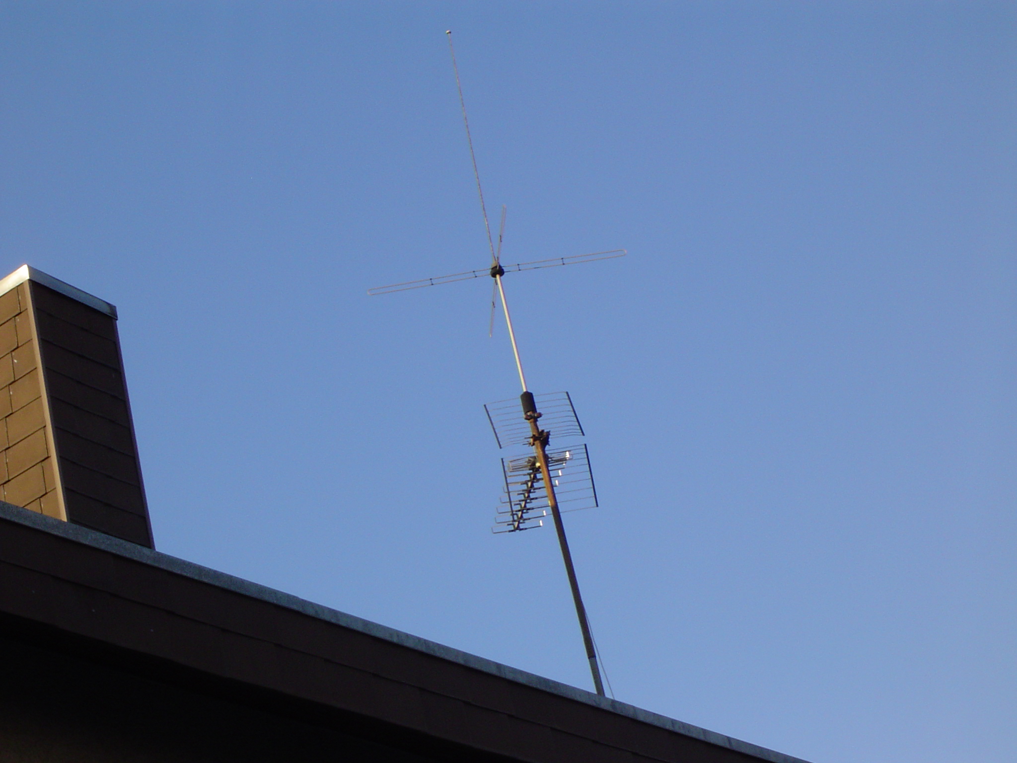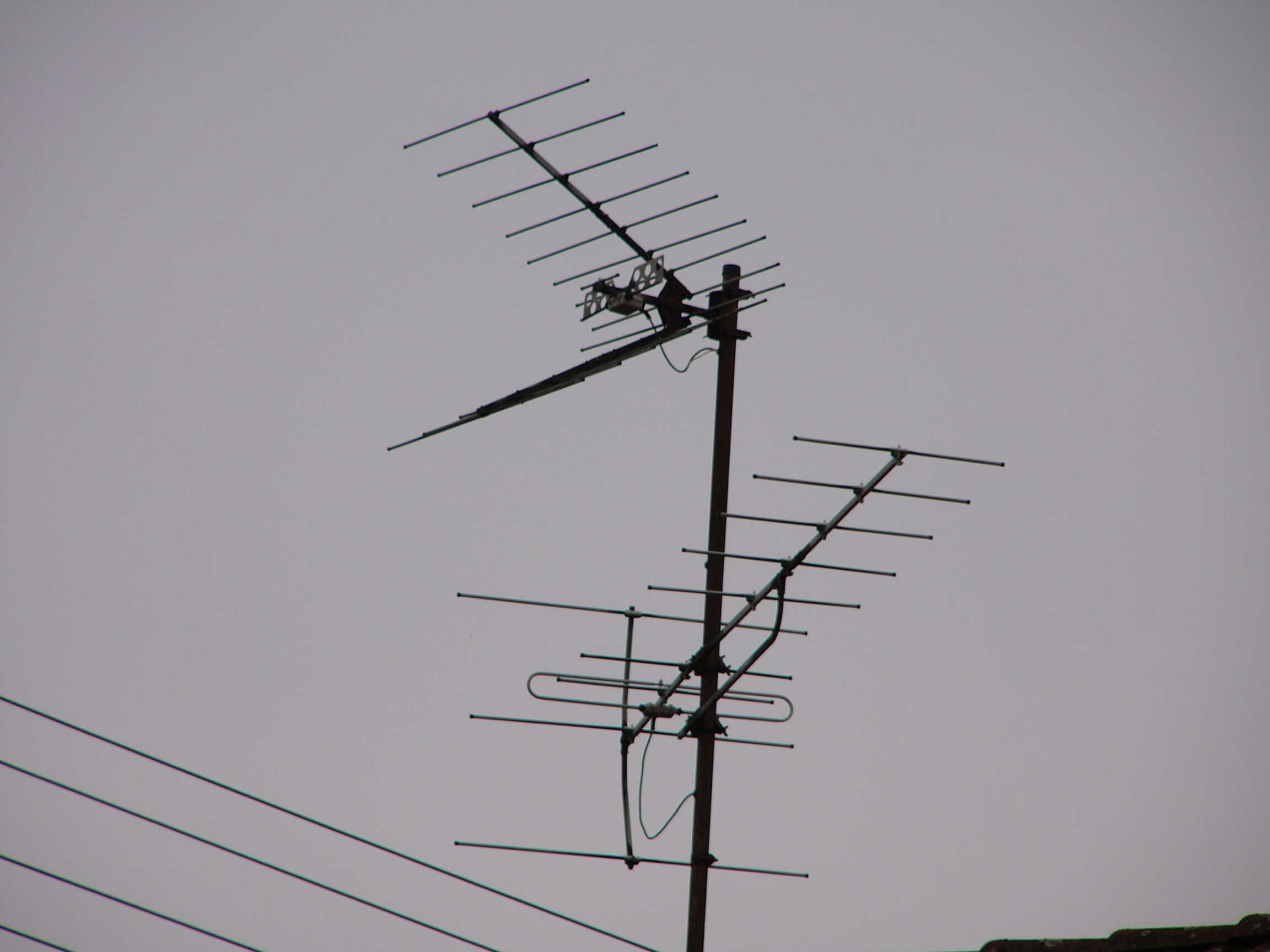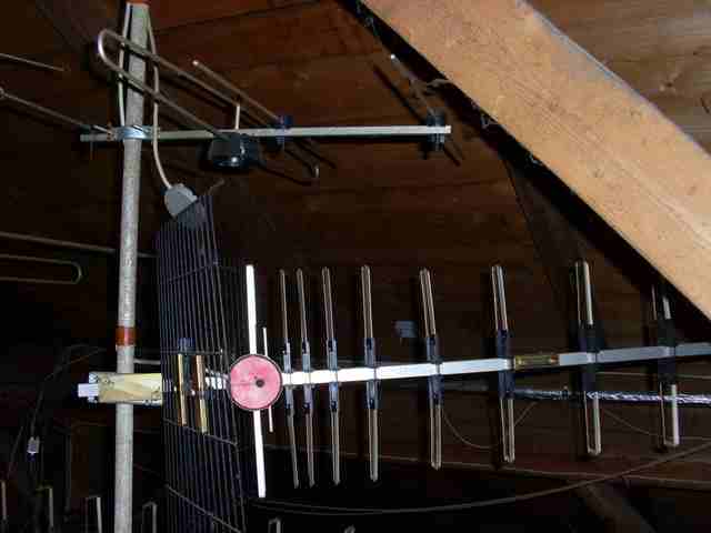 Oben VHF Richtung HD, da wurde gerichtet nach Osten vertikal ARD ausgestrahlt. Ebenfalls auf UHF. Warum man dann noch ne Antenne montiert hat? Unten ggf. Fuba?, Richtung HD.