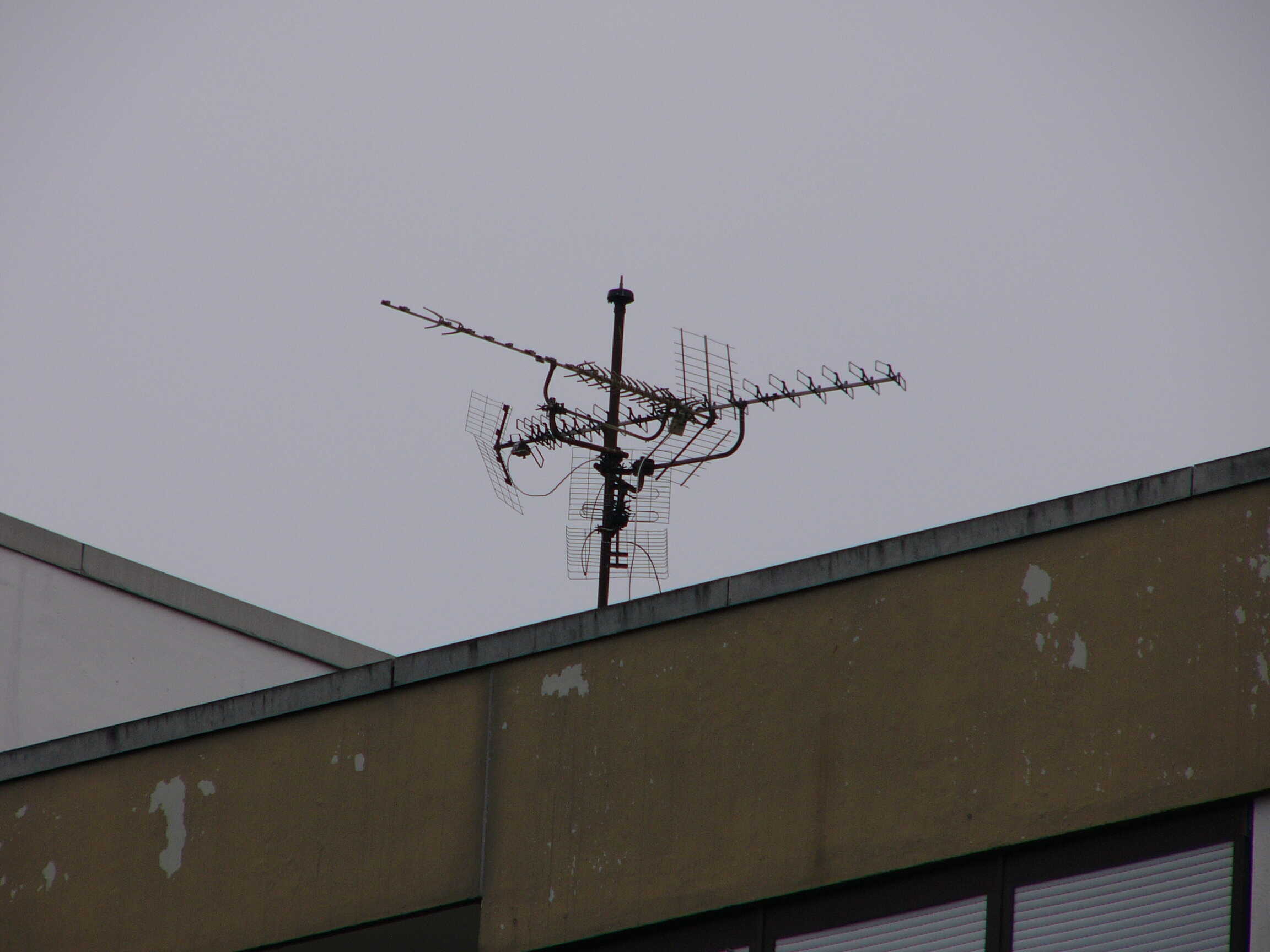 Mit Antennen hatte ich schon als Bub zu tun. Nachdem ich einen alten Fernseher geschenkt bekam, mußte auch eine passende Antenne her. Das ist nun genau 40 Jahre her. Besonders die große Kathrein Olympia hat es mir angetan, liebevoll Gitterantenne genannt. Das Kabelfernsehen wurde grade eingeführt, am Sperrmülltag war dann genug zu finden. Mit meinem Freund bin ich losgezogen. Mit vollgepackten Fahrrädern vor der Eisdiele kauften wir uns noch ein Eis. Das war ein Blickfang. Bei uns im Haus ist die Antenne am Dachboden, parallel dazu installierte ich dann meine Gebrauchtantenne. Später dann umgebaut auf DVB-T, nach Umstellung auf DVB-T2 stillgelegt aber nie ausgebaut. Später kaufte ich dann eine Nagelneue Olympia AOS, das ist die Zweitgrößte aus dieser Serie. Die kleinste hieß AOI, entsprechend größer, AON, AOP, AOS, AOT. Die VHF Typen waren: Multika AV 06, 09, 11, 12, oder die Monoka das waren VHF Antennen genau auf einen Kanal abgestimmt mit gestrecktem Dipol. Eine Fuba ist auch dabei den Typ kenne ich leider nicht, ich nannte sie immer Wäscheklammernantenne. Noch ein Bild von meinem Nachbargebäude mit noch vorhandener Hausantenne von oben: Olympia AOS, 2x Multika AV06 und eine UHF AU06, im Vordergrund ist noch eine Antenne für den BOS Funk, gehört zur Sirene und für den Betriebsfunk der Gemeinde. Gruß Jochen