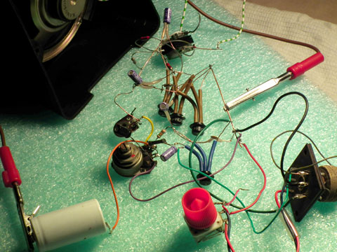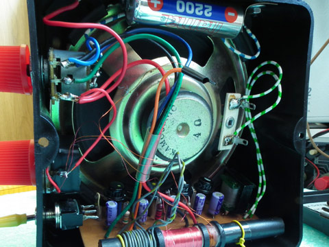 Da ich jetzt frei hatte, bin ich mit dem Germaniumradio vorangekommen. Den zusammengelöteten Haufen Teile habe ich in eine gehäusefreundlichere Form gebracht und mit in den Lautsprecher gebaut. So richtig "mini" gemäß des Themas und Funkschauartikels ist es nun allerdings nicht geworden. In der Bastelkiste fand ich noch ein Schalterpoti, so dass ich mir für den bereits eingebauten Kippschalter eine neue Aufgabe ausdenken muss. Vielleicht wird's eine Wellenbereichsumschaltung. Oder lieber eine Stromsparschaltung? Versuche haben ergeben, dass für eine sehr geringe unverzerrte Lautstärke auch 0,5mA Ruhestrom für die Endstufe ausreichen, was die Laufzeit des Akkus knapp verzehnfachen würde. Andererseits reichen 500 Betriebsstunden mit einer Akkuladung wohl auch aus.