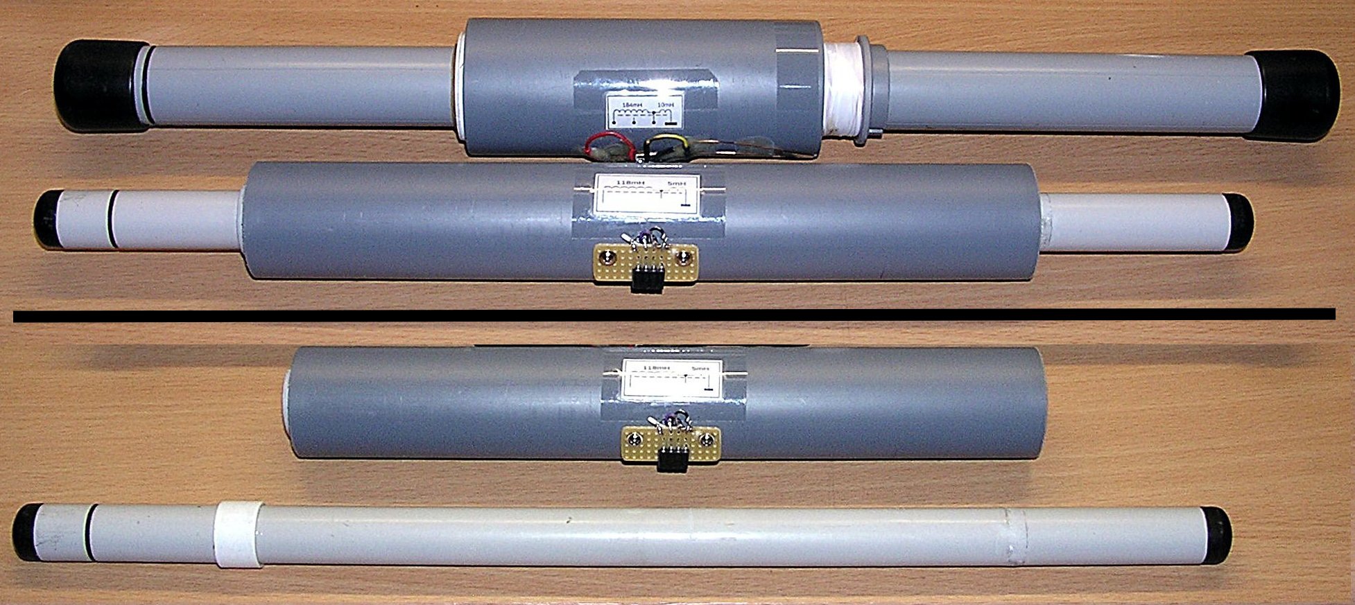 Der obere Ferritstab stammt von einem LW-Ferritmodul der Firma BAZ, die Spule besteht aus 0,3mm Cul. wild überkreuz gewickelt. Der Abstand der Wicklung zum Kern beträgt etwa 4mm. Eine genaue Angabe ist nicht möglich, weil der Kern aus Viererbündeln Ferritrohr besteht, die nicht das ganze Tragrohr ausfüllen. Die rote Kurve zeigt den Güteverlauf. Der zweite Stab besteht aus zwei Dreierbündeln, die axial miteinander verklebt sind und die Spule ist ebenfalls mit 0,3mm Cul. gewickelt, hier jedoch aufgeteilt in 6 Kammern. Der Abstand zum Kern beträgt rund 3mm. Beide Kerne lassen sich aus den Spulen herausziehen, sodaß man leicht andere Wicklungen benutzen kann. Als Beispiel eine der beiden mit gezogenem Kern in der unteren Bildhälfte. Mit der größeren hatte ich einige Mühe, um sie für SAQ zu optimieren. Mit HF-Litze wäre sicher noch einiges herauszuholen aber das gäbe einen gewaltigen Wickel. Mit weniger Abstand zum Kern wäre vielleicht auch das realisierbar aber ob dann die höheren Kernverluste den Vorteil der Litze nicht wieder zunichte machen, bin ich mir nicht sicher.