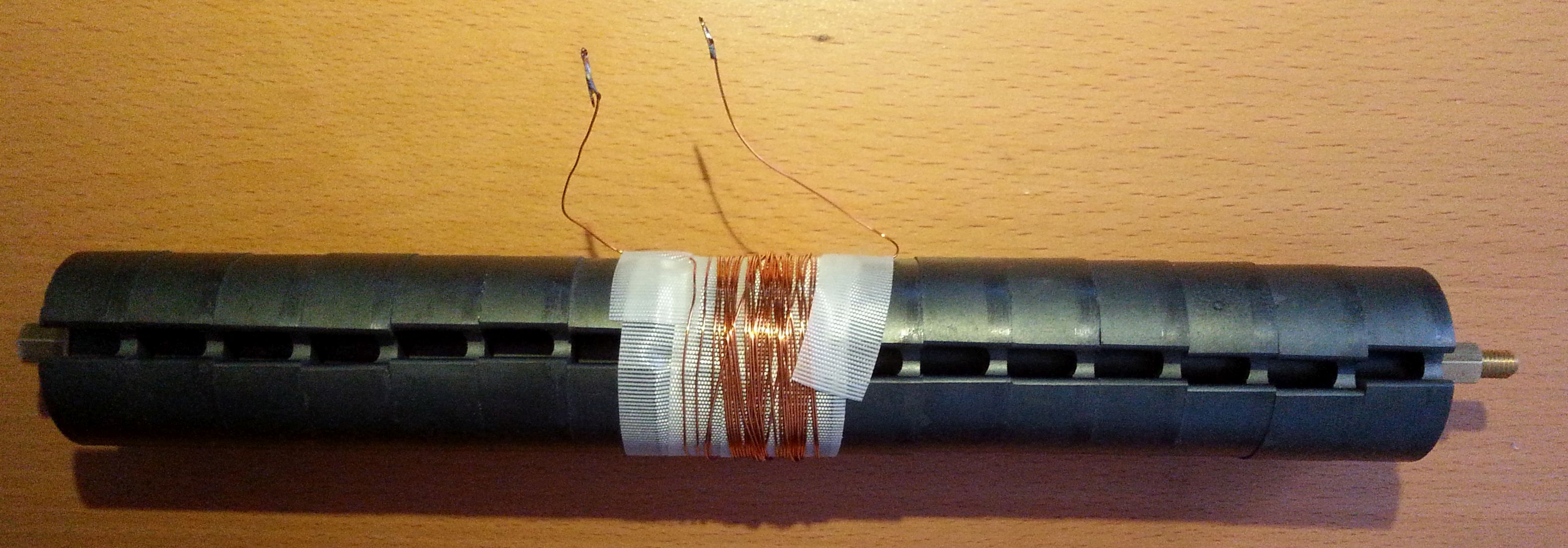 Ziemlich schweres Geschütz. Es handelt sich um 16 Halbschalen (N22, 34x28), in einer Richtung zeigend durch eine Messing-Gewindestange zusammengehalten. Der Wickel hat ca. 40 Windungen auf Glasfaser-Gewebeband.