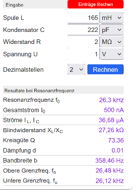 basteljero:Mit Redcrab ergab sich mit Q=70 / Cp=222p / L=165 mH ein Parallel-Verlustwiderstand von etwa 2 MOhm.